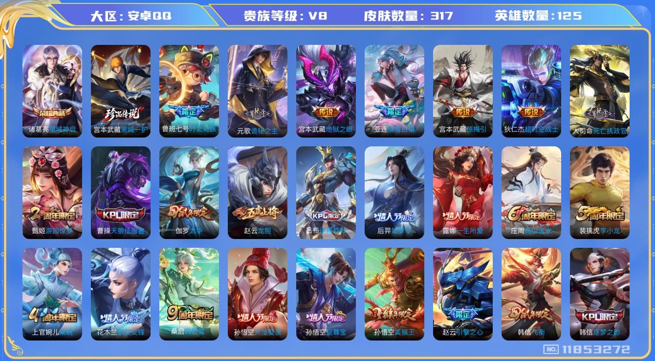 [11853272]V8 1典藏 1珍品传说 11传说 125英雄 317皮肤 可修改实名 优质装备:星域神启(倪克斯贼亮),黑崎一护,地狱之眼,超时空战士-狄仁杰,惊梅引,鲁班七号-时之奇旅,诡秘之主,涂山容容 传说皮:落雪白狼,死亡执政官 珍宝阁皮:妄想食味,蔷薇恋人 限定皮:逐霄战戟,鸣野蒿,至尊宝,太华(伽罗年限),飞衡(韩信年限),高山流水,武圣,游园惊梦,梁祝,龙胆,天狼征服者,李小龙,逐梦之影,如梦令-后羿,默契交锋-花木兰,一生所爱,大圣娶亲,引擎之心,美猴王 史诗皮:鸭鸭历险记-刘禅,化蝶舞,灵蛊蚀心,星界战将,龙之律动,石田雨龙,百相守梦-周瑜,破空之剑,东方月初,蒙犽顽岩魄,百相守梦-百里守约,百相守梦-黄忠,织梦人,守夜人,紫霞仙子,白龙吟,特工魅影,千年之狐,永昼,江河有灵,高渐离燃音魔法,蒙恬荣光圣徽,无限星赏官,冰冠公主,偶像歌手,白蛇,晚萤,末日机甲-吕布,猫狗日记-孙策,猫狗日记-大乔,时之恋人-孙尚香,乱世虎臣,节奏热浪,摇滚巨星,水果甜心,绅士熊喵,天才门将,星夜王子,心灵骇客,功夫厨神,德古拉伯爵,暗隐猎兽者,幽灵船长,鬼剑武藏,心灵战警,舞动绿茵,地狱岩魂,纤云弄巧,繁星吟游(呼啦呼啦),拒霜思,缤纷独角兽,乘风破浪,逐浪之夏,水晶猎龙者,曙光守护者,箭羽风息,金属风暴,原初追逐者,圣诞恋歌,鹰眼统帅,未来纪元-赵云