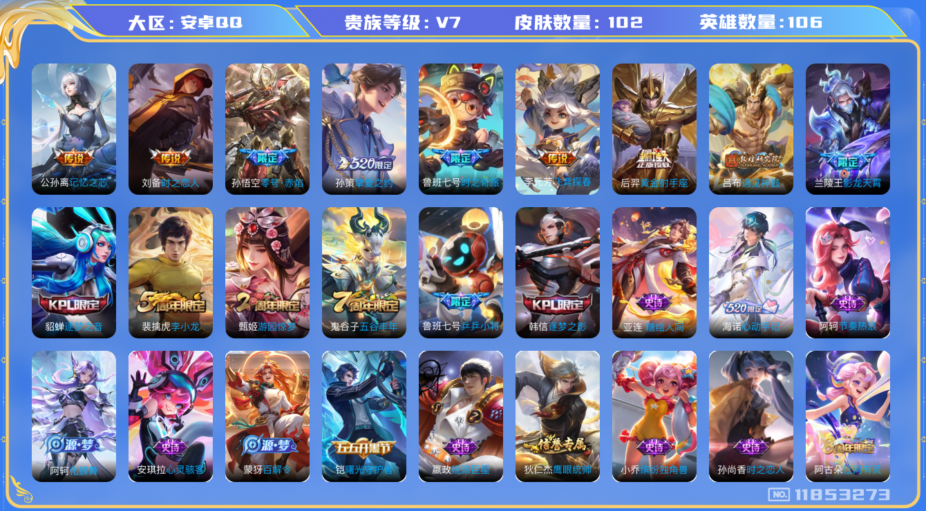 [11853273]V7 9传说 106英雄 102皮肤 可修改实名 优质装备:黄金射手座,零号·赤焰,飞鸢探春,时之恋人-刘备(电焊工),挚爱之约,记忆之芯(机甲兔),遇见神鼓,鲁班七号-时之奇旅 珍宝阁皮:蔷薇恋人 限定皮:影龙天霄,五谷丰年,游园惊梦,逐梦之音,李小龙,逐梦之影,乒乒小将 史诗皮:糖绘人间,化蝶舞,东方月初,海诺心动手记,白龙吟,黄金分割率,江河有灵,真我赫兹(百里守约),百解令(蒙犽),时之恋人-孙尚香,节奏热浪,女仆咖啡,摇滚巨星,水果甜心,心灵骇客,缤纷独角兽,曙光守护者,鹰眼统帅,魅力维加斯,未来纪元-赵云