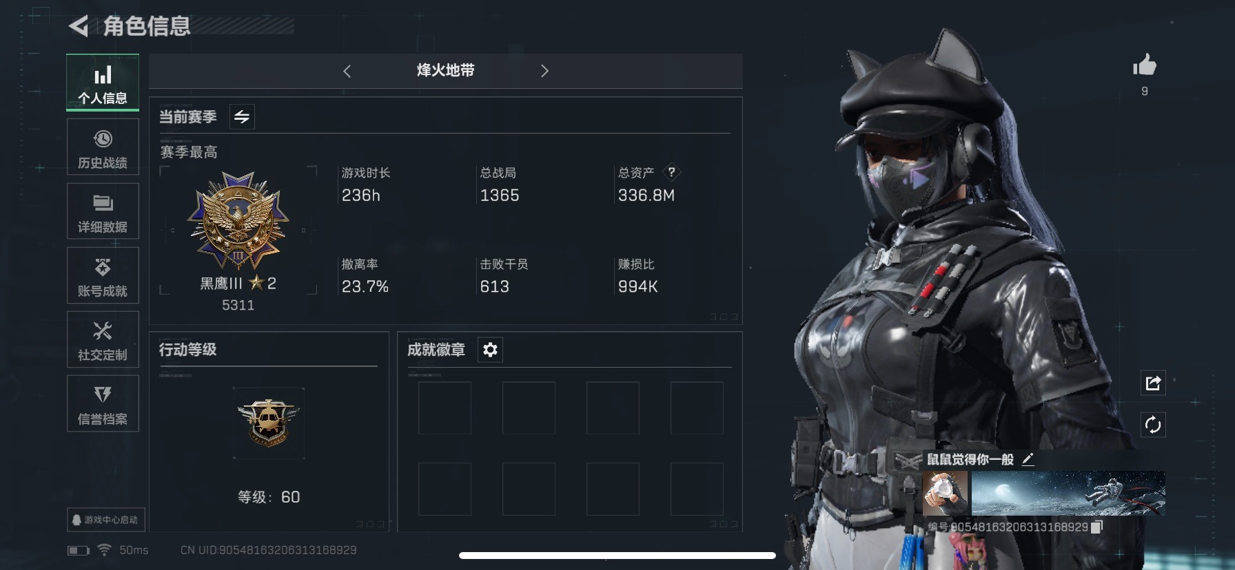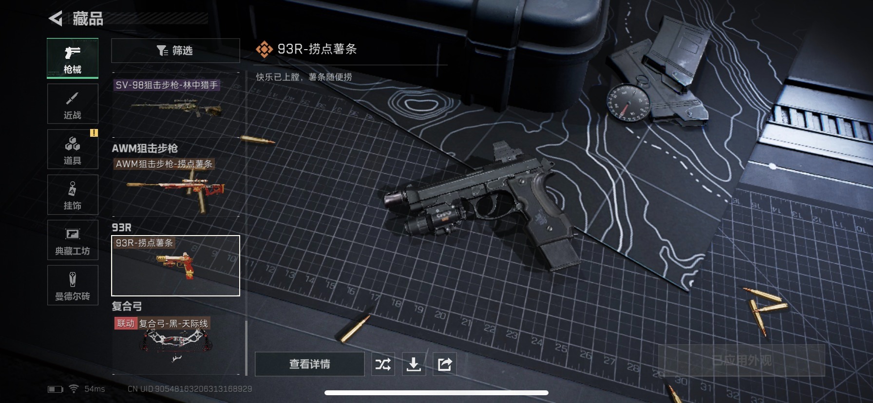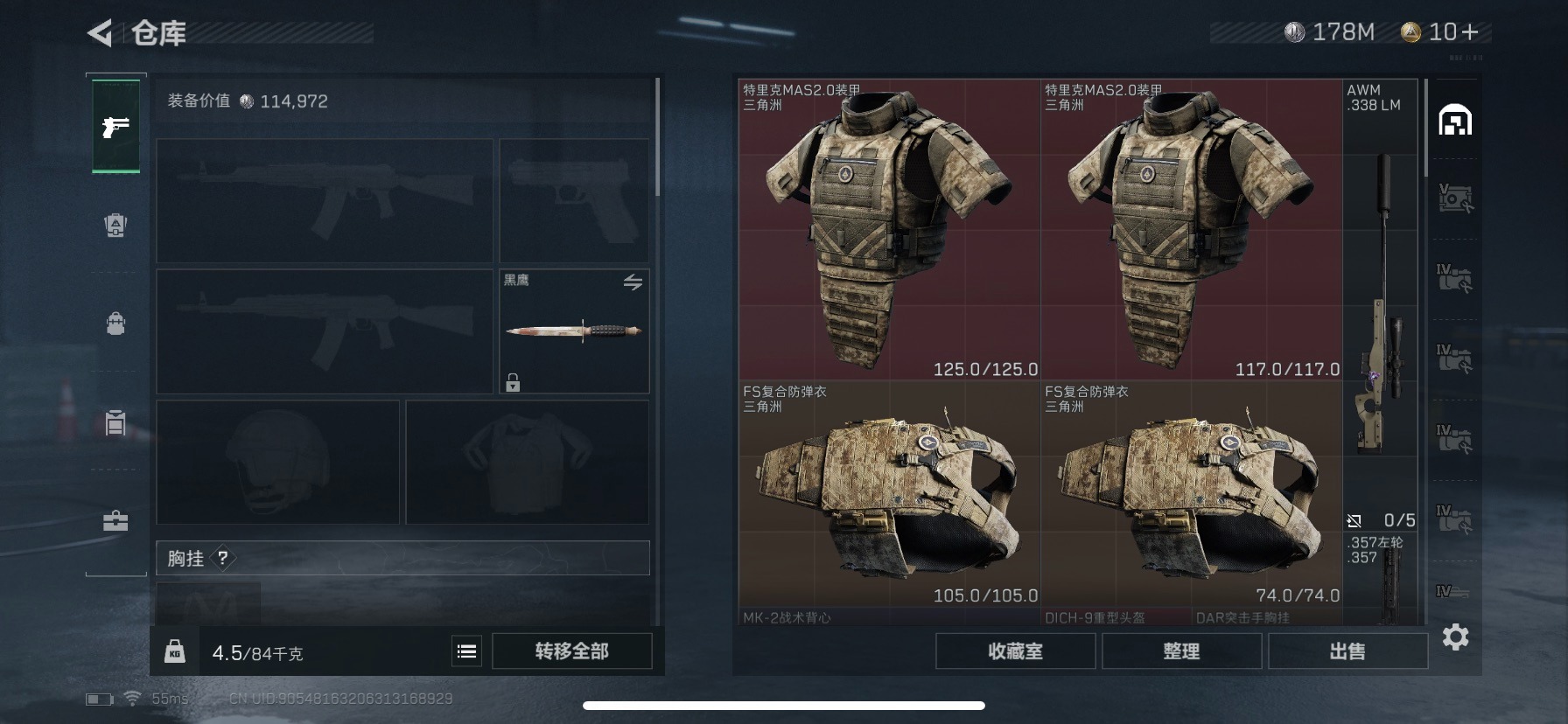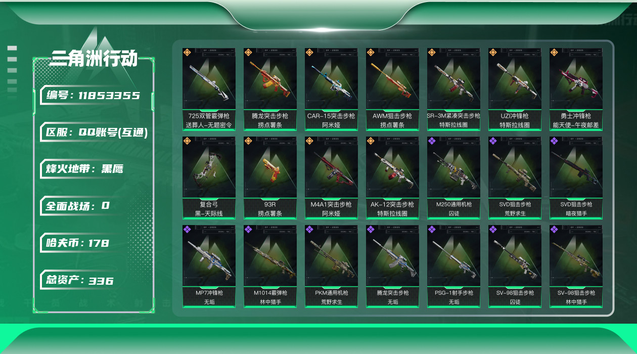 [11853355]总资产:336.8M 2干员外观 11传说枪械 哈夫币:178K高级安全箱(9.17到期) 可二次 可修改实名 烽火地带段位:黑鹰 全面战场段位:无段位 传说武器皮肤:UZI冲锋枪-特斯拉线圈,AWM狙击步枪-捞点薯条,腾龙突击步枪-捞点薯条,93R-捞点薯条,AK-12突击步枪-特斯拉线圈,SR-3M紧凑突击步枪-特斯拉线圈,勇士冲锋枪-能天使-午夜邮差,复合弓-黑-天际线,725双管霰弹枪-送葬人-无题密令,M4A1突击步枪-阿米娅,CAR-15突击步枪-阿米娅 史诗武器皮肤:M16A4突击步枪-竞赛选手,M1014霰弹枪-林中猎手,AKM突击步枪-林中猎手,SVD狙击步枪-暗夜猎手,SV-98狙击步枪-林中猎手,PKM通用机枪-荒野求生,M250通用机枪-囚徒,SV-98狙击步枪-囚徒,腾龙突击步枪-无垢,MP7冲锋枪-无垢,PSG-1射手步枪-无垢,SVD狙击步枪-荒野求生,SR-3M紧凑突击步枪-荒野求生 干员外观:蜂医-送葬人·无题密令(S5),露娜-黑·天际线