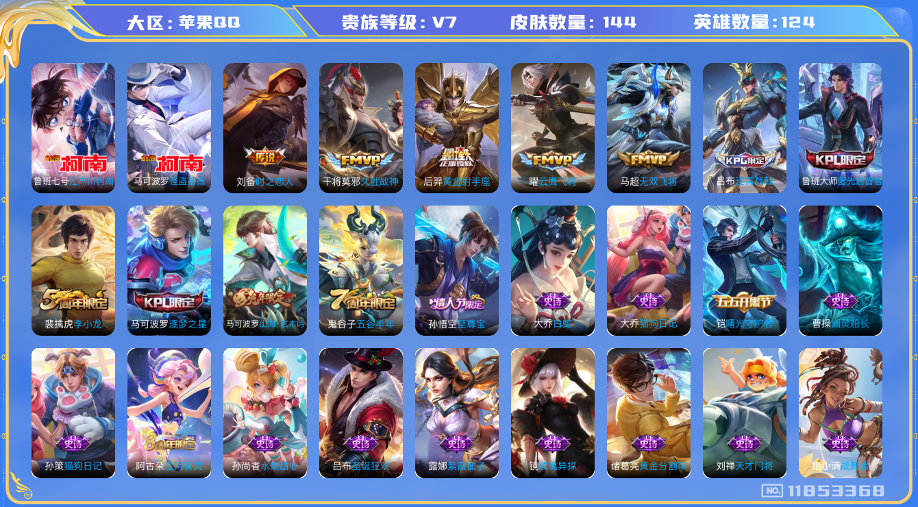 [11853368]V7 2珍品传说 5传说 124英雄 144皮肤 可修改实名 优质装备:江户川柯南,怪盗基德,黄金射手座,云鹰飞将(小将军),久胜战神,时之恋人-刘备(电焊工),无双飞将 珍宝阁皮:玩趣恶龙 限定皮:逐霄战戟,至尊宝,五谷丰年,逐梦之星,李小龙,匿光启智者,山海·玄木吟(马可年限) 史诗皮:战舞者,东方月初,紫霞仙子,黄金分割率,特工魅影,江河有灵,白蛇,猫狗日记-孙策,猫狗日记-大乔,修罗,摇滚巨星,水果甜心,天才门将,暗隐猎兽者,幽灵船长,鬼剑武藏,逐浪之夏,水晶猎龙者,曙光守护者,金属风暴,圣诞狂欢,圣诞恋歌,鹰眼统帅,魅力维加斯,赏金猎手,未来纪元-赵云,玫瑰异探