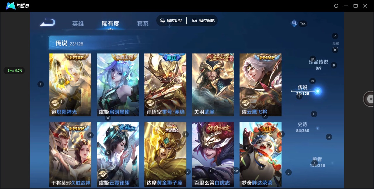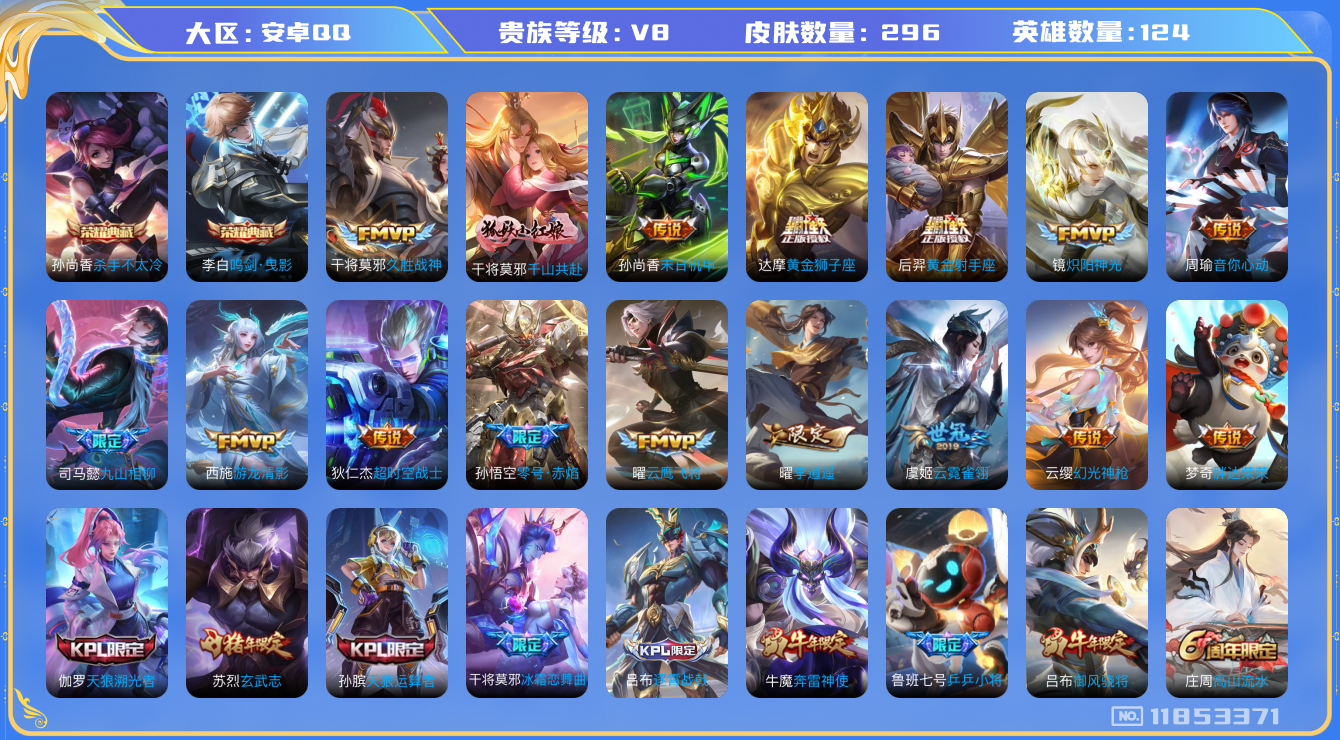 [11853371]V8 2典藏 23传说 124英雄 296皮肤 可修改实名 优质装备:杀手不太冷,鸣剑·曳影,黄金狮子座,黄金射手座,云鹰飞将(小将军),久胜战神,炽阳神光,云霓雀翎,末日机甲-孙尚香(绿蚂蚱),零号·赤焰,音你心动-周瑜,胖达荣荣,李逍遥,游龙清影(小青龙),超时空战士-狄仁杰,千山共赴 传说皮:九山相柳,幻光神枪 珍宝阁皮:妄想食味,玩趣恶龙 限定皮:逐霄战戟,鸣野蒿,白虎志(电光耗子),梅西,魔法小厨娘,白晶晶,时雨天司(水龙头),高山流水,武圣,天狼运算者,梁祝,御风骁将(吕布年限),天狼狩猎者,逐梦之星,天狼溯光者,奔雷神使(牛魔年限),祈雪灵祝(雪兔子),天狼绘梦者,李小龙,玄武志(苏烈年限),朱雀志(守约年限),霸王别姬-虞姬,默契交锋-兰陵王,默契交锋-花木兰,大圣娶亲,冰霜恋舞曲,乒乒小将,蜜橘之夏 史诗皮:星界战将,织梦人,紫霞仙子,苍穹之光,电玩小子(小书包),黄金分割率,特工魅影,江河有灵,魅语,无限星赏官,冰冠公主,偶像歌手,晚萤,暗夜猫娘,末日机甲-吕布,猫狗日记-孙策,乱世虎臣,节奏热浪,修罗,女仆咖啡,摇滚巨星,水果甜心,绅士熊喵,天才门将,星夜王子,心灵骇客,功夫厨神,德古拉伯爵,暗隐猎兽者,幽灵船长,鬼剑武藏,心灵战警,舞动绿茵,地狱岩魂,诗语江南,纤云弄巧,繁星吟游(呼啦呼啦),缤纷独角兽,乘风破浪,逐浪之夏,水晶猎龙者,曙光守护者,箭羽风息,金属风暴,原初追逐者,圣诞狂欢,圣诞恋歌,鹰眼统帅,魅力维加斯,黎明之约,未来纪元-赵云