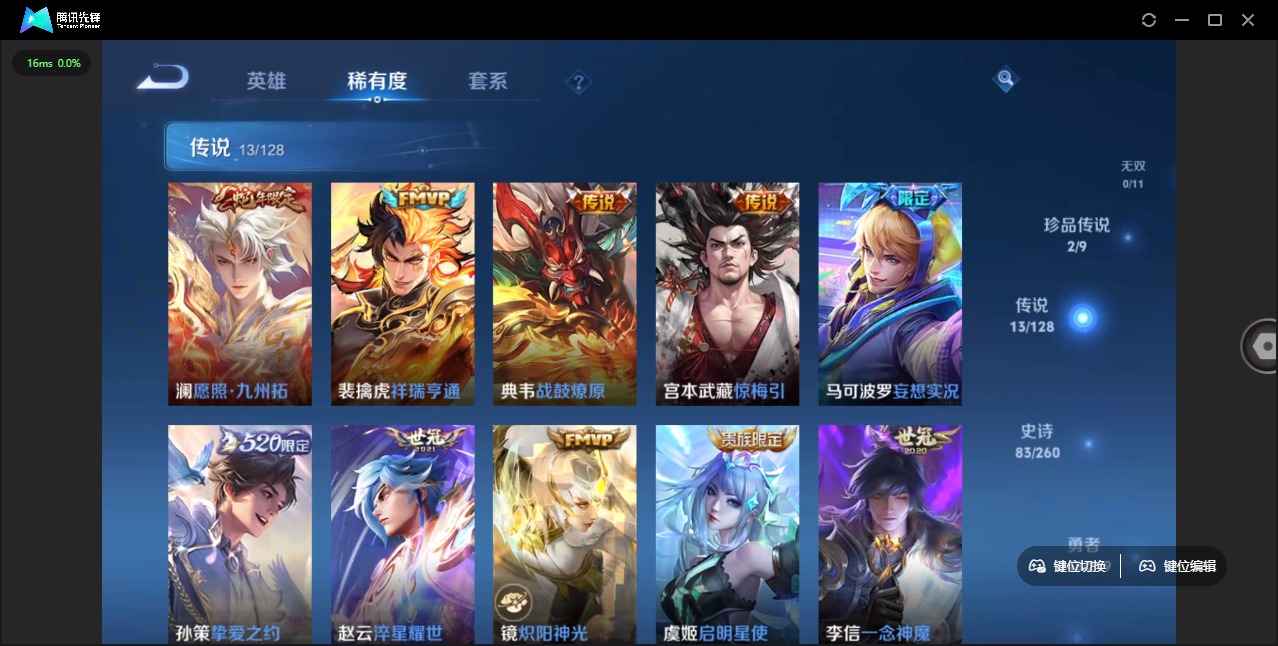 [11853378]V8 2典藏 2珍品传说 13传说 124英雄 319皮肤 可修改实名 优质装备:无限飓风号(高达),鸣剑·曳影,怪盗基德,炽阳神光,一念神魔,云霓雀翎,末日机甲-孙尚香(绿蚂蚱),淬星耀世,超时空战士-狄仁杰,挚爱之约,妄想实况,惊梅引 珍品传说:时之奇旅-孙策 传说皮:典韦战鼓燎原,祥瑞亨通 珍宝阁皮:优雅恋人,蔷薇恋人 限定皮:愿照·九州拓(澜年限),至尊宝,遇见飞天,五谷丰年,梁祝,天狼溯光者,李小龙,冰霜恋舞曲 史诗皮:化蝶舞,龙之律动,石田雨龙,百相守梦-周瑜,茶境仙,琥珀纪元伽罗,百相守梦-百里守约,百相守梦-黄忠,紫霞仙子,电玩小子(小书包),黄金分割率,特工魅影,千年之狐,匿光侦查者,魅语,蒙恬荣光圣徽,冰冠公主,偶像歌手,电玩·爆裂旋风,暗夜猫娘,龙骑士(小龙虾),末日机甲-吕布,猫狗日记-孙策,乱世虎臣,节奏热浪,修罗,女仆咖啡,水果甜心,绅士熊喵,天才门将,星夜王子,功夫厨神,暗隐猎兽者,幽灵船长,鬼剑武藏,心灵战警,舞动绿茵,繁星吟游(呼啦呼啦),拒霜思,缤纷独角兽,乘风破浪,逐浪之夏,水晶猎龙者,曙光守护者,箭羽风息,金属风暴,原初追逐者,圣诞狂欢,圣诞恋歌,鹰眼统帅,魅力维加斯,黎明之约,无心,未来纪元-赵云
