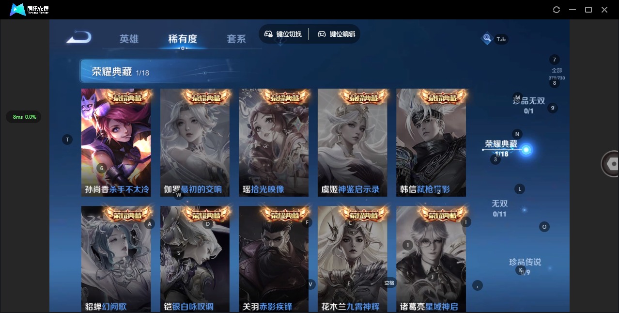 - PX_2096128-10 安卓QQ/永恒钻石/186皮肤/123英雄/1典藏/0珍品无双/0无双/0珍品传说/8传说/36史诗/7稀有英雄 【1 典藏皮肤】拾光映像 瑶, 【8 传说皮肤】地狱火 孙悟空,地狱之眼 宫本武藏,武陵仙君 诸葛亮,末日机甲 孙尚香,山海·炽霜斩 李信,超时空战士 狄仁杰,幻光神枪 云缨,鸣野蒿 桑启, 【36 史诗皮肤】末日机甲 吕布,紫霞仙子 露娜,苍穹之光 项羽,
