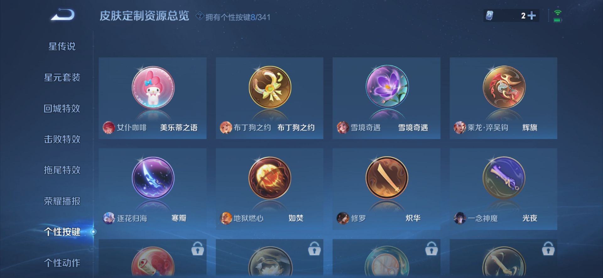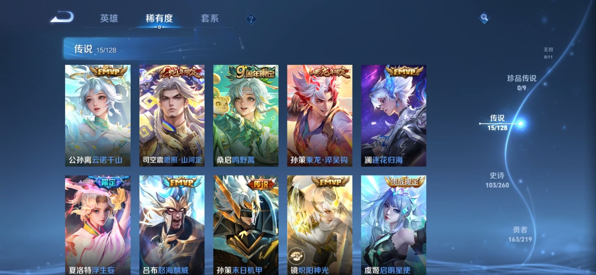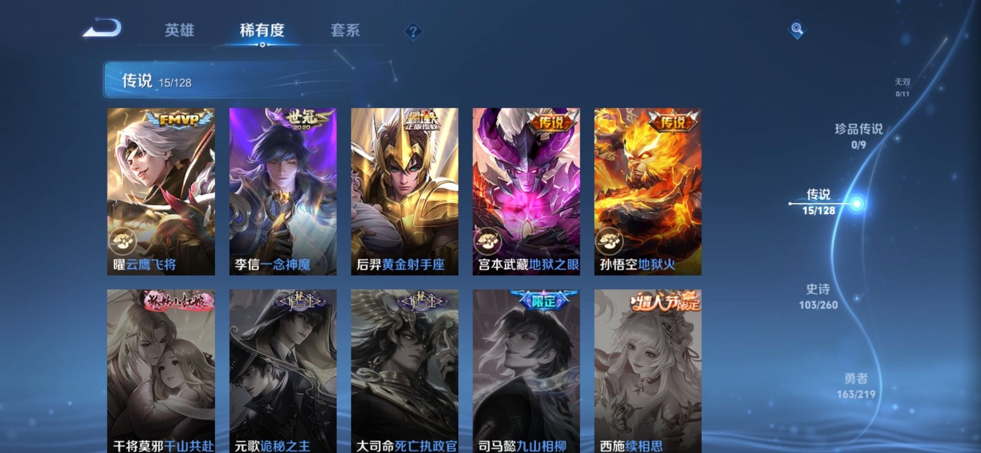 刘邦夺宝奇兵,夏侯惇朔风刀,老夫子醍醐杖,沈梦溪大漠名商,盾山御銮,苏烈千军破阵,典韦穷奇,典韦蓝屏警告,达摩沙漠行僧,牛魔御旌,项羽苍威无极,鲁班七号狮舞东方,吕布猎兽之王,镜青焰无极,元歌云间偶戏,兰陵王金庭之子,裴擒虎擒涛扼浪,鲁班大师探海日志,明世隐疑决卦,鬼谷子原初探秘者,张良古海寻踪,女娲朔望之晖,桑启海盐诗旅,狄仁杰万华元夜,嬴政白昼王子,芈月重明,程咬金演武夺筹,李元芳银河之约,李元芳云中旅人,弈星混沌棋,米莱狄御霄,钟馗神迹守卫,钟馗驱傩正仪,狂铁御狮