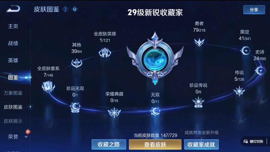 - PX_2063392-贵族等级: V6 英雄数: 75 皮肤数: 57 传说皮: 仲夏夜之梦,零号·赤焰,典韦战鼓燎原 限定皮: 鸣野蒿,陌上桑,映山客,逐霄战戟