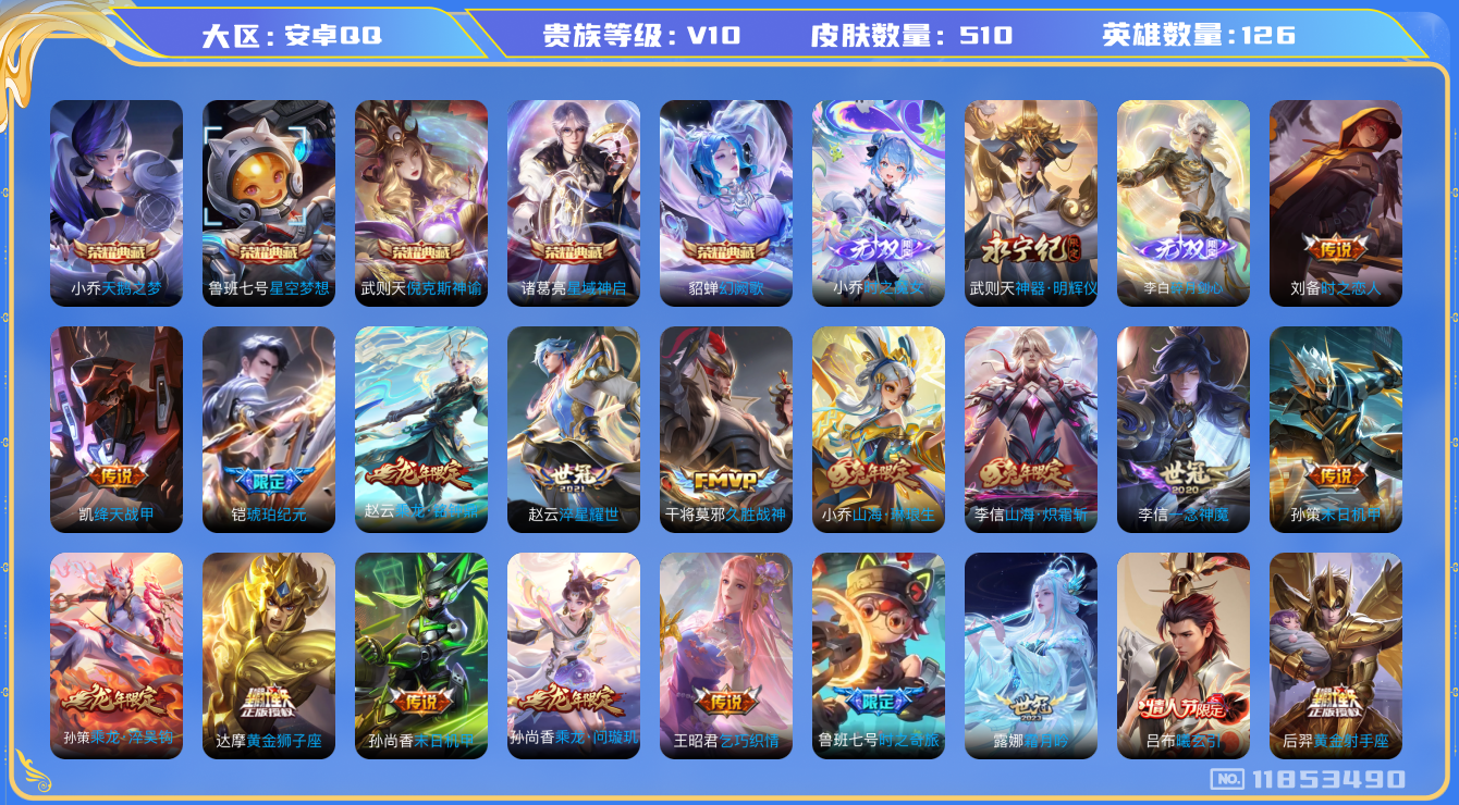 [11853490]V10 5典藏 3无双 61传说 126英雄 510皮肤 典藏英雄武则天 可修改实名 优质装备:天鹅之梦(小乔典藏),星空梦想(太空人),倪克斯神谕(宇宙婆娘),星域神启(倪克斯贼亮),幻阙歌(貂蝉典藏),神器·明辉仪,碎月剑心(李白无双),小乔时之魔女(小乔无双),黄金狮子座,黄金射手座,冠军飞将,云鹰飞将(小将军),绛天战甲(鸡嘴战神),黄金白羊座,猫影幻舞,久胜战神,炽阳神光,一念神魔,云霓雀翎,末日机甲-孙尚香(绿蚂蚱),地狱火,仲夏夜之梦(大飞蛾),零号·赤焰,海洋之心,地狱之眼,飞鸢探春,胖达荣荣,乞巧织情,时之恋人-刘备(电焊工),游龙清影(小青龙),淬星耀世,超时空战士-狄仁杰,末日机甲-孙策,无双飞将,神器·狴犴令,神器·明辉仪,山海·炽霜斩(李信年限),山海·琳琅生(小乔年限),山海·苍雷引(电光曜子),燃星之曲,记忆之芯(机甲兔),灼幽烈阳,鲁班七号-时之奇旅,永恒水手月亮,夜礼服假面,霜月吟,澜逐花归海,艾琳觅芳踪,琥珀纪元铠,琥珀纪元马超,涂山容容 传说皮:乘龙·问璇玑(孙尚香年限),乘龙·铭钟鼎(赵云年限),乘龙·淬吴钩(孙策年限),貂蝉曦玄引,吕布曦玄引,落雪白狼 珍宝阁皮:妄想食味,优雅恋人,女武神 限定皮:逐霄战戟,鸣野蒿,至尊宝,白虎志(电光耗子),凤求凰(白切鸡),凤凰于飞,太华(伽罗年限),武陵仙君(小桃花),傲雪梅枪,寅虎·展翼(孙膑年限),时之彼端,魔法小厨娘,白晶晶,时雨天司(水龙头),神威(电光马子),飞衡(韩信年限),玄嵩(庄周年限),山海·碧波行(瑶年限),无限倾心-项羽,至美·乘鲤谣,遇见飞天,无限倾心-虞姬,齐天大圣,匿光决锋者,五谷丰年,青龙志(铠年限),冰锋战神,幽恒(沐浴露),天狼运算者,游园惊梦,梁祝,天狼狩猎者,逐梦之星,烈魂,岱宗(典韦年限),天狼溯光者,天狼征服者,奔雷神使(牛魔年限),天狼绘梦者,李小龙,朱雀志(守约年限),永曜之星,辉光之辰,如梦令-嫦娥,如梦令-后羿,霸王别姬-虞姬,奇迹圣诞,默契交锋-兰陵王,默契交锋-花木兰,孙行者,猪悟能,一生所爱,大圣娶亲,冰霜恋舞曲,云端筑梦师,乒乒小将,蜜橘之夏,热情桑巴,美猴王,匿光追影者,女儿国国王,寅虎·御盾(廉颇年限),寅虎·瑞焰(虎皮蛋子),寅虎·心曲(虎婆),寅虎·赤拳(老虎年限),玉兔公主,唐三藏,匿光启智者,时之奇旅-妲己,神器