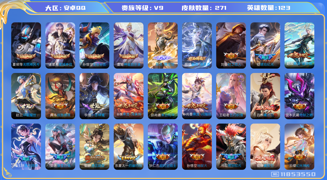 [11853550]V9 4典藏 1无双 1珍品传说 27传说 123英雄 271皮肤 可修改实名 优质装备:无限飓风号(高达),全息碎影(猴子典藏),星域神启(倪克斯贼亮),神鉴启示录,器灵·螭龙剑,器灵·落星盏,一念神魔,末日机甲-孙尚香(绿蚂蚱),地狱火,地狱之眼,乞巧织情,时之恋人-刘备(电焊工),淬星耀世,超时空战士-狄仁杰,遇见胡旋,灼幽烈阳,琥珀纪元铠,琥珀纪元马超 传说皮:乘龙·问璇玑(孙尚香年限),乘龙·铭钟鼎(赵云年限),乘龙·淬吴钩(孙策年限),貂蝉曦玄引,吕布曦玄引,典韦战鼓燎原,落雪白狼,星之鸣奏,幻光神枪 珍宝阁皮:胡桃夹子,女武神 限定皮:愿照·九州拓(澜年限),愿照·岁时盈(虞姬年限),愿照·山河定(司空震年限),至尊宝,异界灵契(白毛香),傲雪梅枪,寅虎·展翼(孙膑年限),白晶晶,神威(电光马子),高山流水,降魔,青龙志(铠年限),冰锋战神,游园惊梦,辉光之辰,如梦令-嫦娥,如梦令-后羿,真爱至上,纯白花嫁,猪悟能,引擎之心,青春决赛季,神奇女侠,匿光追影者,女儿国国王,寅虎·御盾(廉颇年限),寅虎·心曲(虎婆),寅虎·赤拳(老虎年限),山海·玄木吟(马可年限) 史诗皮:器灵·浮梦炉,糖绘人间,狼魂孤将,化蝶舞,琥珀纪元伽罗,蔬乡物语(鲁班七号),曹操夜都魔契,超元猎域,乘龙·聚宝船(安琪拉年限),乘龙·忆丹青(大乔年限),紫霞仙子,电玩小子(小书包),黄金分割率,特工魅影,千年之狐,高渐离燃音魔法,冰冠公主,偶像歌手,电玩·爆裂旋风,暗夜猫娘,龙骑士(小龙虾),末日机甲-吕布,猫狗日记-孙策,猫狗日记-大乔,节奏热浪,修罗,摇滚巨星,水果甜心,天才门将,星夜王子,心灵骇客,功夫厨神,德古拉伯爵,暗隐猎兽者,幽灵船长,鬼剑武藏,心灵战警,地狱岩魂,拒霜思,缤纷独角兽,乘风破浪,逐浪之夏,水晶猎龙者,箭羽风息,金属风暴,圣诞狂欢,圣诞恋歌,鹰眼统帅,王者之锤,暗夜贵公子,魅力维加斯,寅虎·御盾