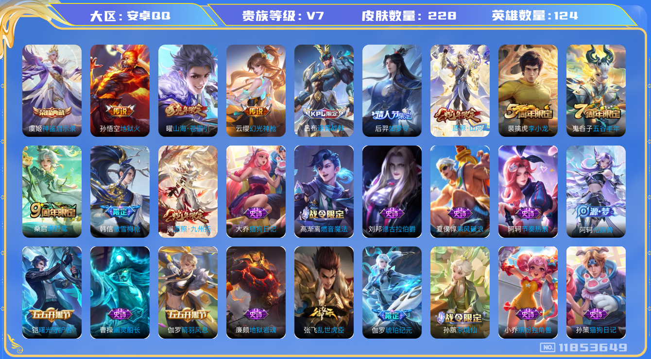 - [11882116]V7 1典藏 11传说 124英雄 209皮肤 可修改实名 优质装备:九霄神辉(木兰典藏),黄金狮子座,地狱之眼,鹤羽星尊 珍宝阁皮:万物之道,优雅恋人 限定皮:愿照·九州拓(澜年限),愿照·福禄聚(蔡文姬年限),愿照·岁时盈(虞姬年限),愿照·山河定(司空震年限),愿照·众生和(妲己年限),愿照·千秋盛(女娲年限),鸣野蒿,白晶晶,无限倾心-项羽,五谷丰年,岱宗(典韦年限),李小龙,山海·玄木吟(马可年限) 史诗皮:鸭鸭历险记-刘禅,器灵·浮梦炉,化蝶舞,星界战将,龙之律动,茶境仙,东方月初,芈月浮光幕影,海诺心动手记,蔬乡物语(鲁班七号),紫霞仙子,特工魅影,千年之狐,永昼,江河有灵,魅语,百解令(蒙犽),高渐离燃音魔法,冰冠公主,偶像歌手,电玩·爆裂旋风,百相守梦(刘备),末日机甲-吕布,猫狗日记-孙策,节奏热浪,女仆咖啡,水果甜心,星夜王子,心灵骇客,暗隐猎兽者,鬼剑武藏,暗渊魔法,舞动绿茵,拒霜思,缤纷独角兽,乘风破浪,逐浪之夏,水晶猎龙者,箭羽风息,唤灵魅影,金属风暴,圣诞狂欢,圣诞恋歌,鹰眼统帅,无心