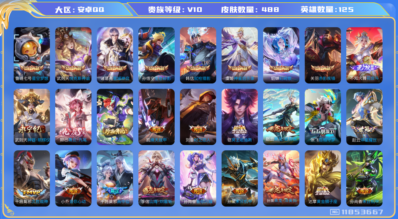 [11853667]V10 8典藏 3无双 1珍品传说 50传说 125英雄 488皮肤 典藏英雄武则天 可修改实名 优质装备:星空梦想(太空人),倪克斯神谕(宇宙婆娘),全息碎影(猴子典藏),星域神启(倪克斯贼亮),赤影疾锋,幻阙歌(貂蝉典藏),弑枪猎影(韩信典藏),神器·明辉仪,青丘·九尾(妲己无双),神鉴启示录,花合斗,黄金狮子座,黄金射手座,冠军飞将,云鹰飞将(小将军),绛天战甲(鸡嘴战神),黄金白羊座,猫影幻舞,久胜战神,炽阳神光,云霓雀翎,末日机甲-孙尚香(绿蚂蚱),地狱火,仲夏夜之梦(大飞蛾),音你心动-小乔,零号·赤焰,地狱之眼,音你心动-周瑜,胖达荣荣,乞巧织情,时之恋人-刘备(电焊工),淬星耀世,超时空战士-狄仁杰,末日机甲-孙策,无双飞将,音你闪耀(rap皮),碎云,天秀幻梦,神器·明辉仪,山海·炽霜斩(李信年限),山海·苍雷引(电光曜子),燃星之曲,画中仙,浮生妄,记忆之芯(机甲兔),青丘·九尾,百相守梦(张飞),鹤羽星尊,艾琳觅芳踪,金乌负日,朵莉亚心动手记,涂山容容 珍品传说:时之奇旅-孙策 传说皮:乘龙·问璇玑(孙尚香年限),乘龙·铭钟鼎(赵云年限),乘龙·淬吴钩(孙策年限),铠冥王哈迪斯,幻光神枪 珍宝阁皮:妄想食味,胡桃夹子,玩趣恶龙 限定皮:愿照·九州拓(澜年限),愿照·山河定(司空震年限),逐霄战戟,鸣野蒿,至尊宝,凤求凰(白切鸡),武陵仙君(小桃花),瑞麟志(木兰年限),遇见飞天,高山流水,怒海麟威,五谷丰年,冰锋战神,游园惊梦,梁祝,烈魂,李小龙,如梦令-后羿,孙行者,大圣娶亲,天魔缭乱,云端筑梦师,女儿国国王,神器·万象笔,山海·玄木吟(马可年限) 史诗皮:鸭鸭历险记-刘禅,化蝶舞,灵蛊蚀心,星界战将,龙之律动,石田雨龙,百相守梦-周瑜,茶境仙,怒海争锋,破空之剑,涂山红红,东方月初,蒙犽顽岩魄,芈月浮光幕影,海诺心动手记,蔬乡物语(鲁班七号),乘龙·聚宝船(安琪拉年限),乘龙·忆丹青(大乔年限),百相守梦-百里守约,百相守梦-黄忠,织梦人,遇见神鹿,紫霞仙子,苍穹之光,电玩小子(小书包),白龙吟,黄金分割率,特工魅影,千年之狐,永昼,江河有灵,魅语,百解令(蒙犽),高渐离燃音魔法,蒙恬荣光圣徽,无限星赏官,冰冠公主,青蛇,偶像歌手,白蛇,晚萤,电玩·爆裂旋风,百相守梦(刘备),暗夜猫娘,百相守梦(关羽),银翎春语,龙骑士(小龙虾),末日