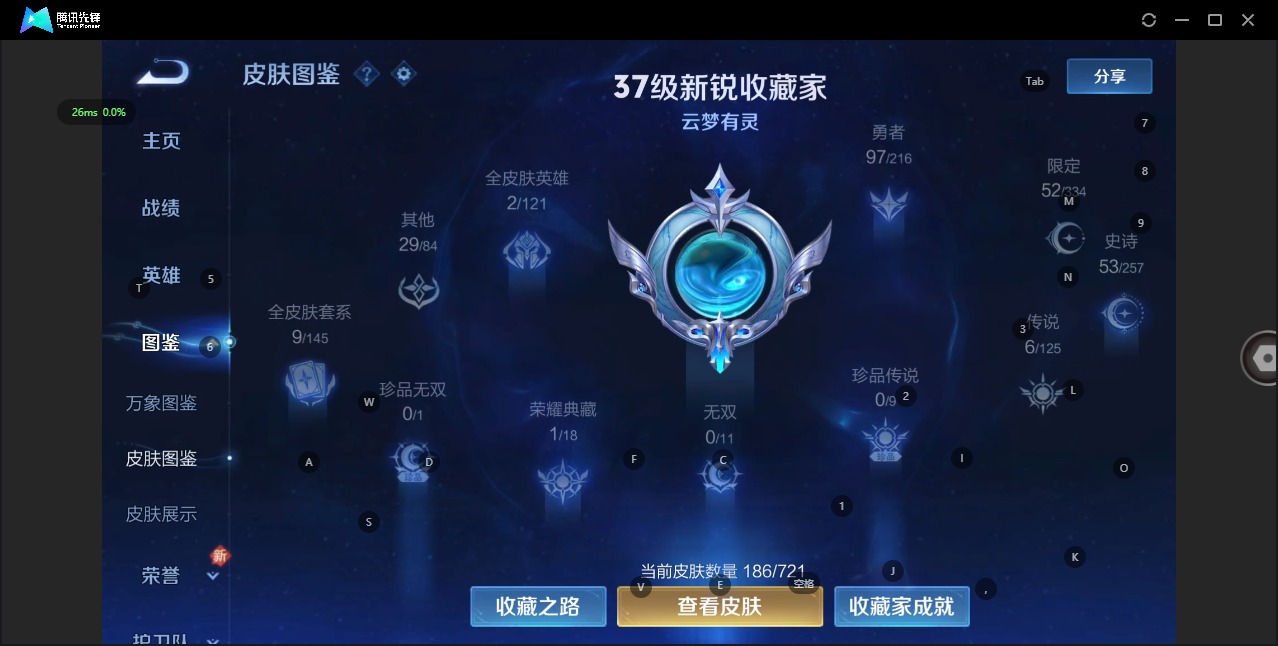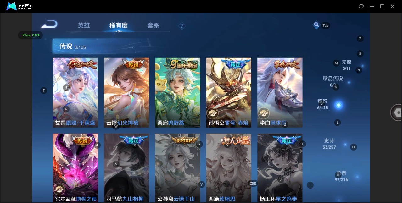 - [11296504]V9 3典藏 18传说 125英雄 332皮肤 典藏英雄武则天 可修改实名 荣耀水晶:鸣剑·曳影,全息碎影(猴子典藏),杀手不太冷 传说皮:黄金狮子座,黄金射手座,仲夏夜之梦(大飞蛾),海洋之心,地狱之眼,一念神魔,久胜战神,云鹰飞将(小将军),炽阳神光,超时空战士-狄仁杰 珍宝阁皮:妄想食味,优雅恋人,玩趣恶龙 限定皮:鸣野蒿,至尊宝,白虎志(电光耗子),凤求凰(白切鸡),太华(伽罗年限),梅西,白晶晶,时雨天司(水龙头),神威(电光马子),遇见飞天,高山流水,五谷丰年,冰锋战神,天狼运算者,游园惊梦,梁祝,御风骁将(吕布年限),祈雪灵祝(雪兔子),李小龙,逐梦之影,辉光之辰,霸王别姬-项羽,纯白花嫁,猪悟能,一生所爱,大圣娶亲,天魔缭乱,青春决赛季,冰霜恋舞曲 史诗皮:鸭鸭历险记-刘禅,龙之律动,百相守梦-黄忠,怒海争锋,百相守梦-周瑜,幻珠鲛人,遇见神鹿,紫霞仙子,苍穹之光,电玩小子(小书包),白龙吟,黄金分割率,特工魅影,千年之狐,永昼,末日机甲-莱西奥,蒙恬荣光圣徽,冰冠公主,偶像歌手,晚萤,魅语,暗夜猫娘,末日机甲-吕布,猫狗日记-孙策,猫狗日记-大乔,乱世虎臣,节奏热浪,修罗,女仆咖啡,摇滚巨星,水果甜心,绅士熊喵,天才门将,星夜王子,心灵骇客,功夫厨神,德古拉伯爵,暗隐猎兽者,幽灵船长,鬼剑武藏,心灵战警,天秀·启明,舞动绿茵,地狱岩魂,纤云弄巧,繁星吟游(呼啦呼啦),拒霜思,缤纷独角兽,乘风破浪,逐浪之夏,水晶猎龙者,曙光守护者,箭羽风息,金属风暴,原初追逐者,圣诞狂欢,圣诞恋歌,鹰眼统帅,暗夜贵公子,魅力维加斯,黎明之约,赏金猎手,奇遇舞章,无心,未来纪元-赵云