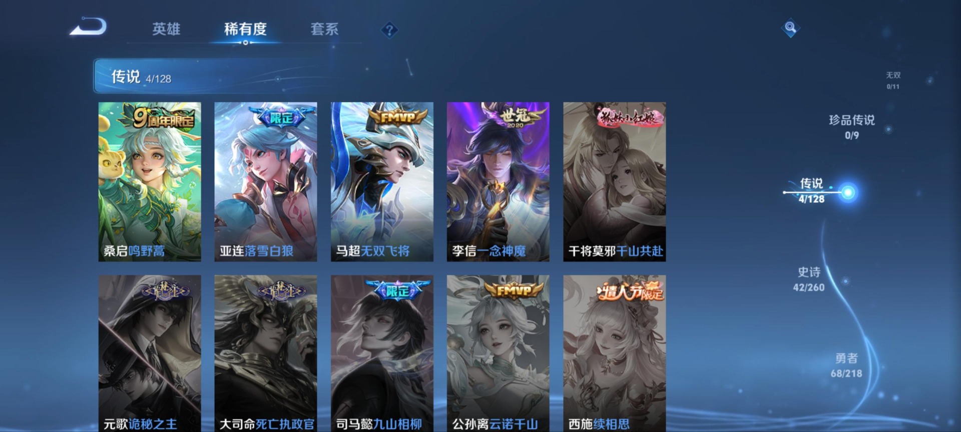 - [11687631]V7 1典藏 1珍品传说 8传说 124英雄 205皮肤 可修改实名 优质装备:弑枪猎影(韩信典藏),器灵·落星盏,猫影幻舞,一念神魔,末日机甲-孙策 传说皮:幻光神枪 珍宝阁皮:优雅恋人,蔷薇恋人,女武神 限定皮:愿照·岁时盈(虞姬年限),逐霄战戟,至尊宝,武陵仙君(小桃花),飞衡(韩信年限),高山流水,诗剑行,怒海麟威,五谷丰年,游园惊梦,岱宗(典韦年限),孙行者,引擎之心 史诗皮:器灵·浮梦炉,化蝶舞,星界战将,龙之律动,茶境仙,百相守梦-百里守约,紫霞仙子,苍穹之光,黄金分割率,特工魅影,江河有灵,蒙恬荣光圣徽,偶像歌手,暗夜猫娘,末日机甲-吕布,猫狗日记-孙策,时之恋人-孙尚香,乱世虎臣,节奏热浪,女仆咖啡,摇滚巨星,水果甜心,绅士熊喵,天才门将,星夜王子,心灵骇客,功夫厨神,德古拉伯爵,暗隐猎兽者,幽灵船长,鬼剑武藏,心灵战警,舞动绿茵,地狱岩魂,纤云弄巧,拒霜思,缤纷独角兽,乘风破浪,逐浪之夏,水晶猎龙者,金属风暴,原初追逐者,圣诞恋歌,鹰眼统帅,魅力维加斯,黎明之约,无心,未来纪元-赵云