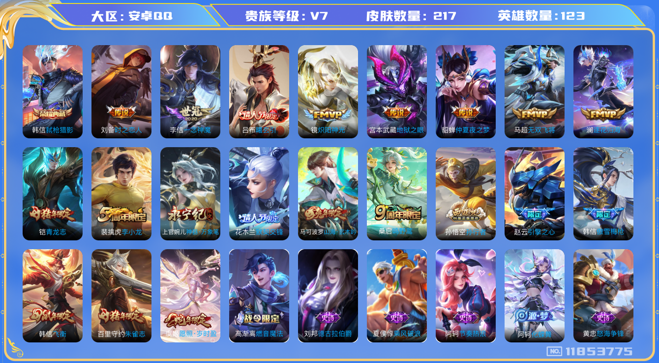 - [12057276]V7 1典藏 8传说 124英雄 193皮肤 可修改实名 达摩大国标 苏烈小国标 优质装备:赤影疾锋,黄金狮子座,绛天战甲(鸡嘴战神),无双飞将,澜逐花归海,千山共赴,涂山容容 传说皮:貂蝉曦玄引,星之鸣奏 珍宝阁皮:蔷薇恋人 限定皮:至尊宝,神威(电光马子),山海·碧波行(瑶年限),诗剑行,降魔,五谷丰年,李小龙,如梦令-后羿,霸王别姬-项羽,默契交锋-花木兰 史诗皮:赞萌露比,鸭鸭历险记-刘禅,龙之律动,百相守梦-周瑜,茶境仙,琥珀纪元伽罗,蔬乡物语(鲁班七号),超元猎域,乘龙·聚宝船(安琪拉年限),百相守梦-黄忠,特工魅影,江河有灵,雪夜绮愿(周瑜),魅语,百解令(蒙犽),高渐离燃音魔法,蒙恬荣光圣徽,偶像歌手,晚萤,暗夜猫娘,乱世虎臣,修罗,摇滚巨星,水果甜心,鬼剑武藏,心灵战警,乐园奇幻夜,纤云弄巧,繁星吟游(呼啦呼啦),拒霜思,缤纷独角兽,逐浪之夏,曙光守护者,金属风暴,原初追逐者,圣诞狂欢,圣诞恋歌,鹰眼统帅,魅力维加斯,黎明之约,未来纪元-赵云