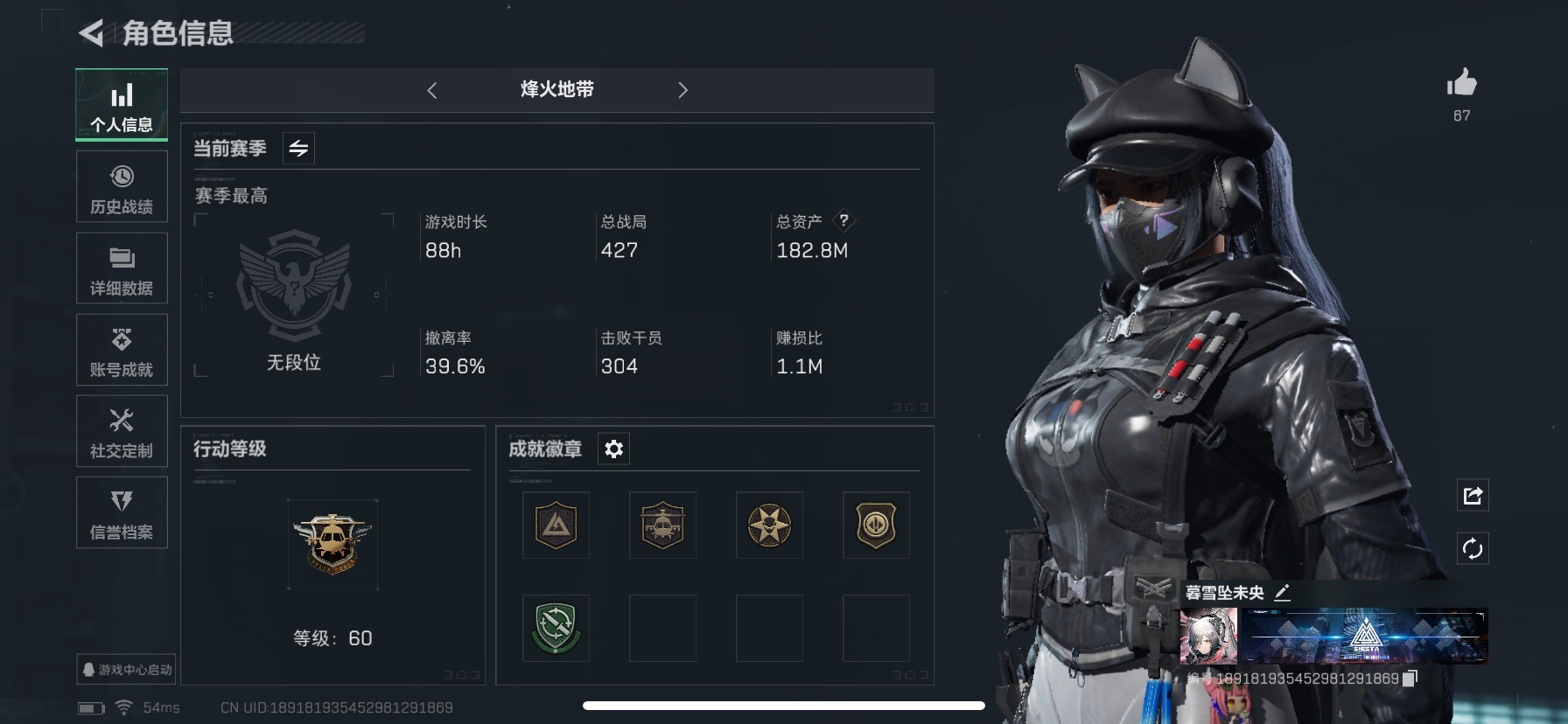 [11853864]总资产:182.8M 3干员外观 1近战传说 16传说枪械 哈夫币:71.199K 可二次 可修改实名 优质装备:近战-北极星,顶级安全箱(3x3) 烽火地带段位:无段位 全面战场段位:无段位 传说武器皮肤:AK-12突击步枪-夜鹰,G18-飞虎,M4A1突击步枪-阿米娅,CAR-15突击步枪-阿米娅,复合弓-黑-天际线,AWM狙击步枪-捞点薯条,QCQ171冲锋枪-北极星,腾龙突击步枪-捞点薯条,93R-捞点薯条,勇士冲锋枪-能天使-午夜邮差,725双管霰弹枪-送葬人-无题密令,K437突击步枪-北极星,M4A1突击步枪-蚀金玫瑰,CAR-15突击步枪-黑鹰坠落,Vector冲锋枪-能天使-午夜邮差 史诗武器皮肤:MP7冲锋枪-原型机(典藏),AUG突击步枪-蝮蛇,PKM通用机枪-蝮蛇,Ash-12战斗步枪-守夜人,SG552突击步枪-尖端治疗,SR-25射手步枪-尖端治疗,PKM通用机枪-荒野求生,MP5冲锋枪-深海恐惧,勇士冲锋枪-深海恐惧,G3战斗步枪-锡兰,SR-3M紧凑突击步枪-荒野求生,M1014霰弹枪-林中猎手,SV-98狙击步枪-林中猎手,SVD狙击步枪-荒野求生,AS Val突击步枪-典狱官,M250通用机枪-囚徒,SV-98狙击步枪-囚徒,SCAR-H战斗步枪-囚徒,PSG-1射手步枪-无垢,M14射手步枪-黑鹰坠落,QBZ95-1突击步枪-曙光,Vector冲锋枪-阿萨拉文明,SVD狙击步枪-阿萨拉工艺 干员外观:红狼-蚀金玫瑰,露娜-黑·天际线,蛊-能天使·午夜邮差