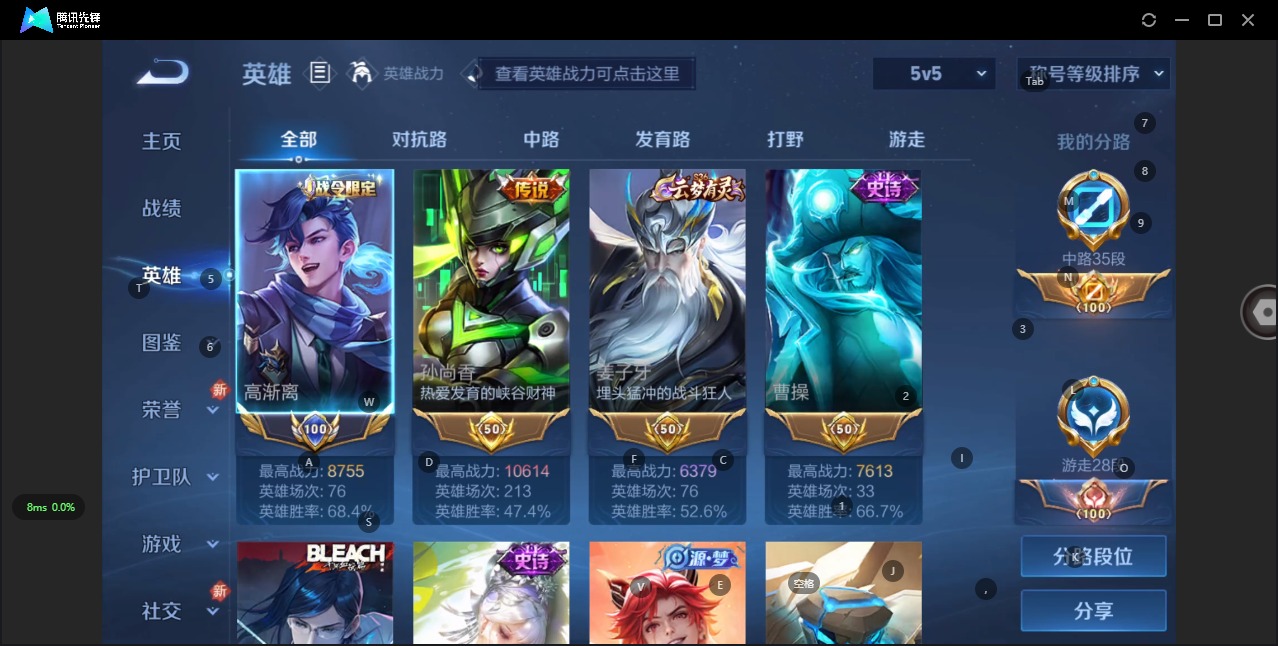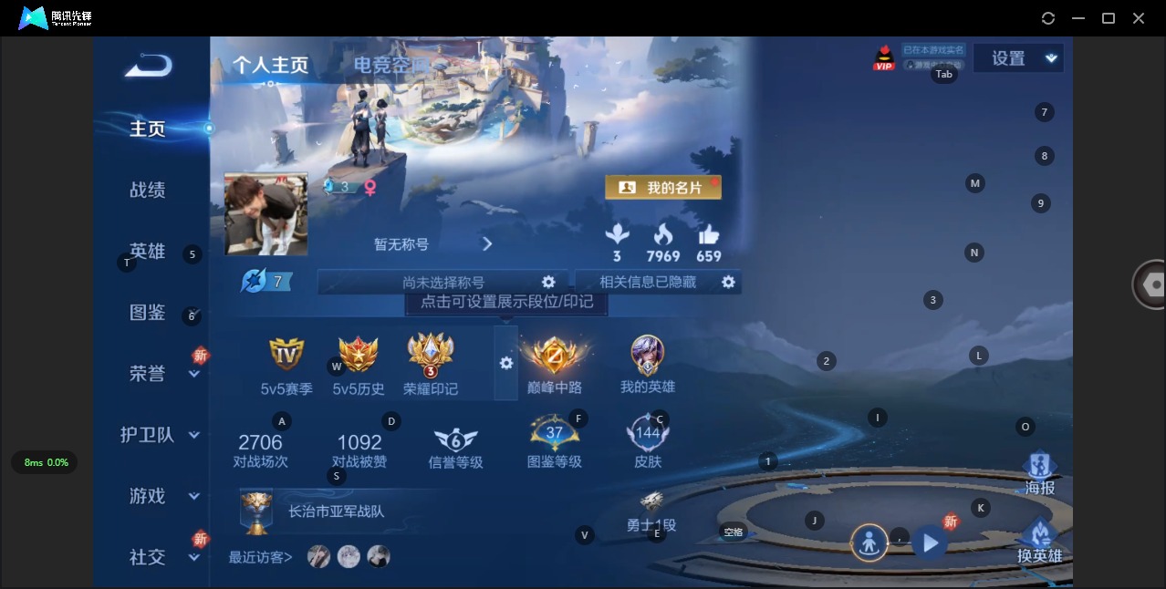 - PX_2111274-实名: 可修改 贵族等级: V8 英雄数: 123 皮肤数: 272 荣耀水晶: 杀手不太冷 传说皮: 黄金狮子座,云鹰飞将,炽阳神光,一念神魔,云霓雀翎,时之恋人-刘备,花朝如约,无双飞将,记忆之芯,灼幽烈阳,小动物乐团,玄雷天君 限定皮: 遇见飞天,李小龙,游园惊梦,青春决赛季,冰霜恋舞曲,大圣娶亲,高山流水,猪悟能,匿光追影者,傲雪梅枪,启示之音,五谷丰年,山海·碧波行