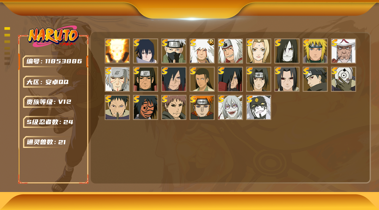 [11853886]V12 24S忍 32A忍 21通灵 1035.9W战力 可二次 可修改实名 优质装备:千手柱间「秽土转生」,罗砂「四代目风影」,宇智波鼬「秽土转生」,药师兜「仙人模式」,宇智波斑「秽土转生」,千手扉间「秽土转生」,宇智波带土 「忍界大战」,“宇智波斑” 「白面具」,漩涡鸣人 「九喇嘛连结」,神秘面具男 「红夜之刃」,宇智波佐助「永恒万花筒」,宇智波佐助「永恒万花筒」,千手柱间·木叶创立,宇智波斑「秽土转生·解」,大筒木桃式,宇智波止水「须佐能乎」,旗木卡卡西「须佐能乎」,自来也 「传说中的三忍」 S级忍者:自来也 「舞之豪杰」,宇智波鼬 「须佐能乎」,佩恩「天道」,猿飞日斩,波风水门,大蛇丸,纲手