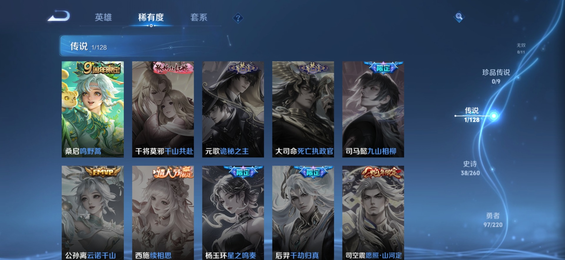 夏侯惇朔风刀,老夫子醍醐杖,沈梦溪大漠名商,盾山御銮,苏烈千军破阵,达摩沙漠行僧,牛魔御旌,兰陵王金庭之子,明世隐疑决卦,鬼谷子原初探秘者,桑启海盐诗旅,狄仁杰万华元夜,程咬金演武夺筹,李元芳云中旅人,弈星混沌棋,米莱狄御霄,钟馗驱傩正仪,狂铁御狮