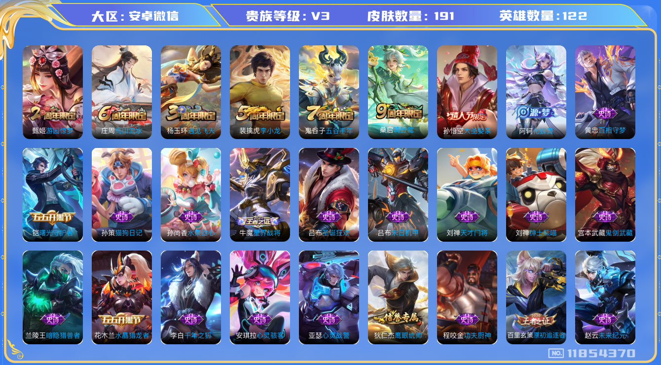 [11854370]V3 1传说 122英雄 191皮肤 可修改实名 安全保护中 珍宝阁皮:妄想食味,女武神 限定皮:鸣野蒿,遇见飞天,高山流水,五谷丰年,游园惊梦,李小龙,大圣娶亲 史诗皮:化蝶舞,星界战将,龙之律动,百相守梦-黄忠,千年之狐,偶像歌手,末日机甲-吕布,猫狗日记-孙策,女仆咖啡,水果甜心,绅士熊喵,天才门将,心灵骇客,功夫厨神,暗隐猎兽者,鬼剑武藏,心灵战警,舞动绿茵,纤云弄巧,繁星吟游(呼啦呼啦),水晶猎龙者,曙光守护者,金属风暴,原初追逐者,圣诞狂欢,鹰眼统帅,魅力维加斯,黎明之约,未来纪元-赵云