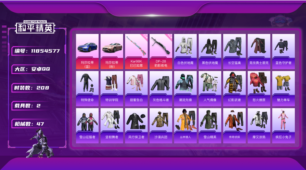 [11854577]2特效枪 2载具 可二次 可修改实名 连体王者 优质装备:玛莎拉蒂Ghibli(蓝),玛莎拉蒂Ghibli(粉),Kar98K-巳巳如意 稀有枪皮:DP-28-豹影疾电 四级特效枪:四级Kar98K-巳巳如意 三级特效枪:三级DP-28-豹影疾电 紫色装扮:SS31特训套装,SS5特训,人气偶像,冰原使者,,凛冬战士,北国孤狼,SS33特训套装,SS13特训,金鼠迎春,长空猛禽,雪山征服者,雪山精英,霓虹街区,蓝色守护者,跃动心情,风行保卫者,无面战甲,飞行日记,魅力单车,黑色伏地魔,沙漠兵团,幻影武者,圣诞大吉,坚韧舞者,怒火燎原,疯狂小兔子,白色伏地魔,甜蜜告白,竞技勇士朋克,潮流先锋,牛气冲天,灰色格斗者,牛气满满,特殊使命,特训学院,精神漫游,炽焰拳师,格斗专家,SS6特训,黑色刀锋,核芯基因,SS7特训,拳皇97草薙京,摩艾涂鸦,SS8特训,SS12特训,SS9特训,SS11特训,SS32特训服(SS32特训套装),萌黄之夏,丛林猎人,传奇侦探