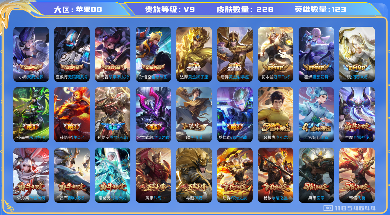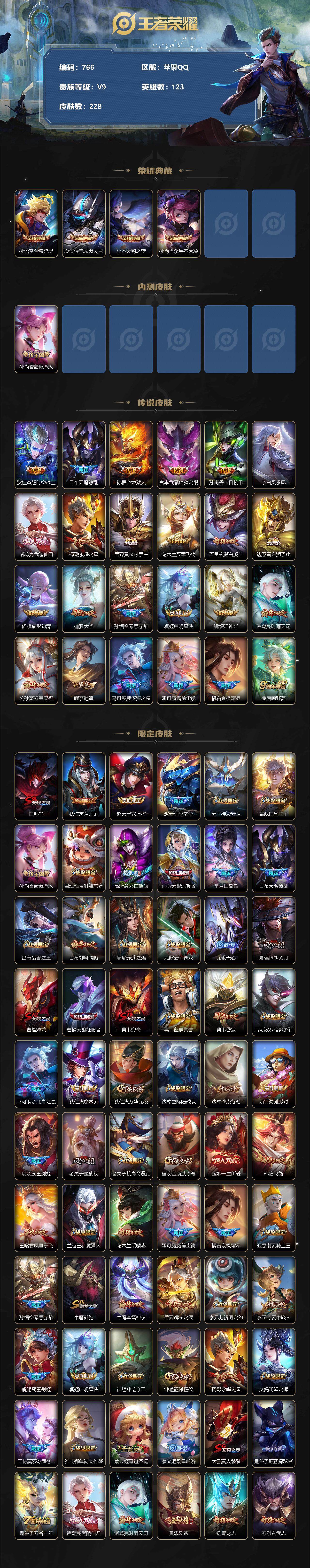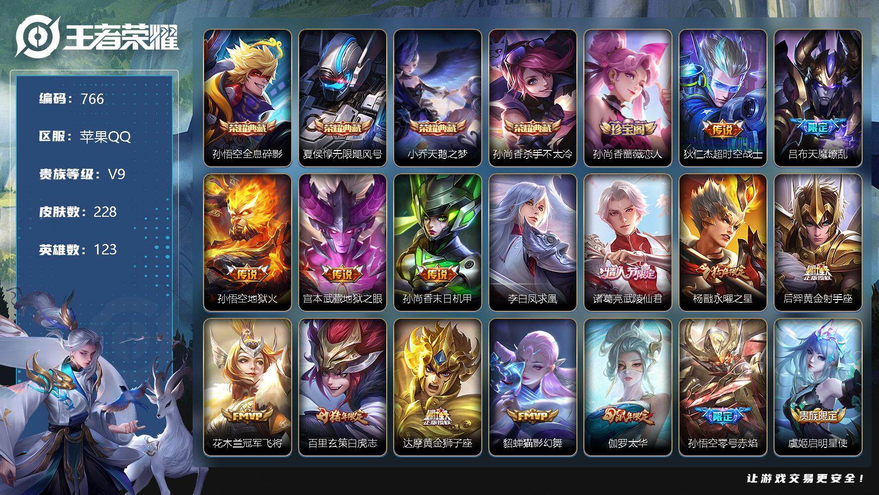 [11854644]【商品标题】:苹果Q-V9-永恒钻石V段位-123英雄-228皮肤-4典藏-0珍品无双-0无双-0珍品传说-24传说-81史诗