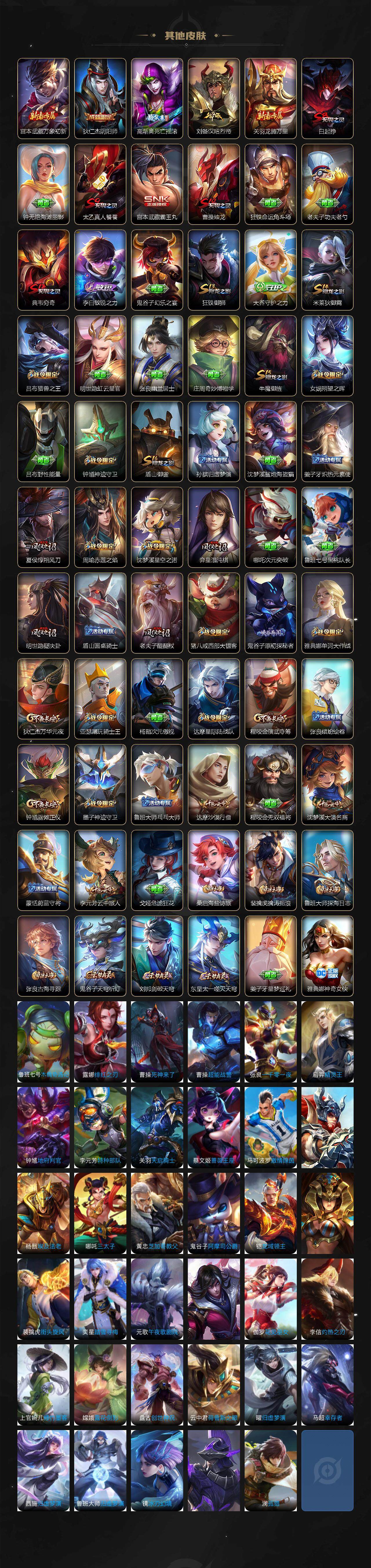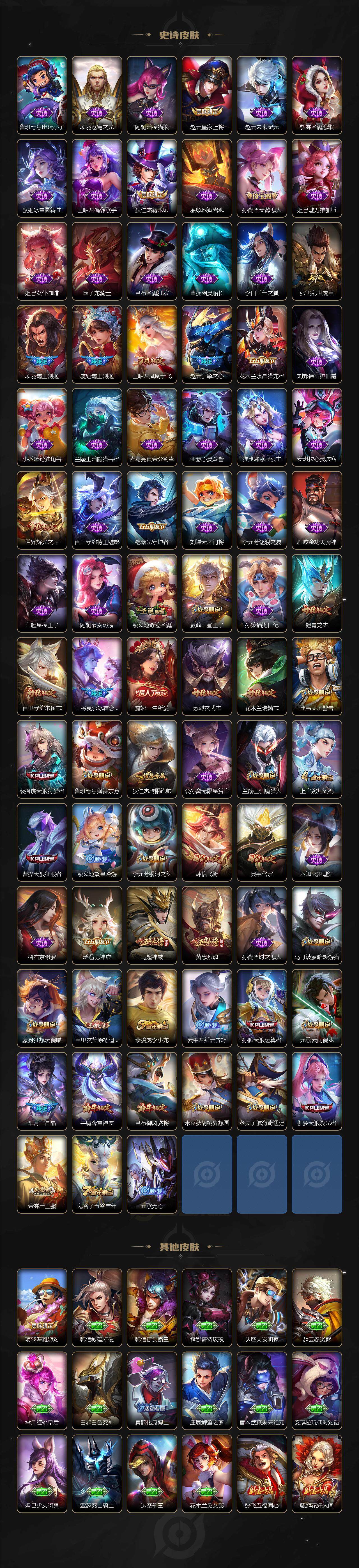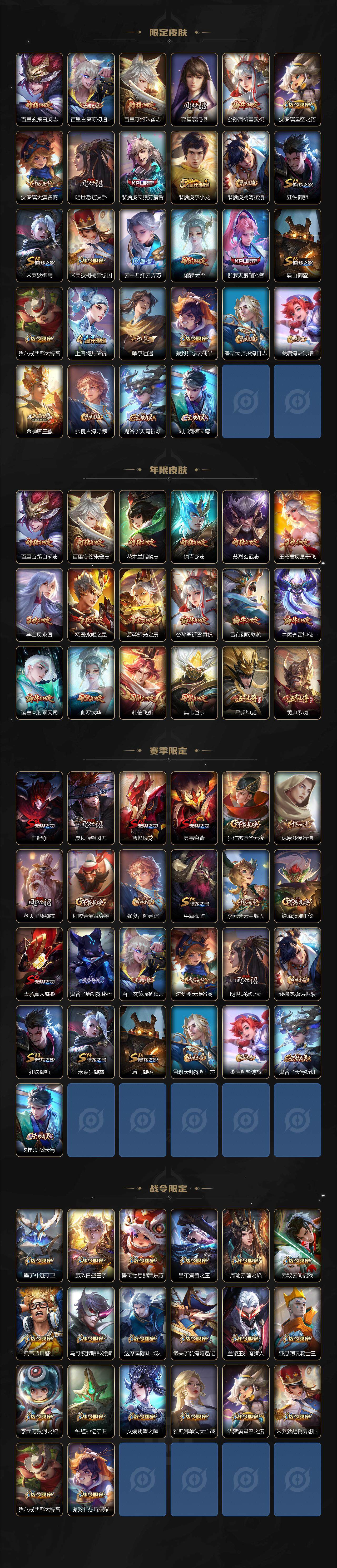 【限定皮肤】:白起狰,狄仁杰阴阳师,赵云皇家上将,赵云引擎之心,墨子神迹守卫,嬴政白昼王子,孙尚香蔷薇恋人,鲁班七号狮舞东方,高渐离死亡摇滚,孙膑天狼运算者,芈月白晶晶,吕布天魔缭乱,吕布猎兽之王,吕布御风骁将,周瑜赤莲之焰,元歌云间偶戏,元歌无心,夏侯惇朔风刀,曹操烛龙,曹操天狼征服者,典韦穷奇,典韦蓝屏警告,典韦岱宗,马可波罗暗影游猎,马可波罗深海之息,狄仁杰魔术师,狄仁杰万华元夜,达摩星际陆战队,达摩沙漠行僧,项羽海滩派对,项羽霸王别姬,老夫子醍醐杖,老夫子航海奇遇记,程咬金演武夺筹,露娜一生所爱,韩信飞衡,王昭君凤凰于飞,兰陵王驯魔猎人,花木兰瑞麟志,娜可露露前尘镜,橘右京枫霜尽,亚瑟潮玩骑士王,孙悟空零号赤焰,牛魔御旌,牛魔奔雷神使,后羿辉光之辰,李元芳银河之约,李元芳云中旅人,虞姬霸王别姬,虞姬启明星使,钟馗神迹守卫,钟馗驱傩正仪,杨戬永曜之星,女娲朔望之晖,干将莫邪冰霜恋舞曲,雅典娜单词大作战,蔡文姬奇迹圣诞,蔡文姬繁星吟游,太乙真人饕餮,鬼谷子原初探秘者,鬼谷子五谷丰年,诸葛亮武陵仙君,诸葛亮时雨天司,黄忠烈魂,铠青龙志,苏烈玄武志,百里玄策白虎志,百里玄策原初追逐者,百里守约朱雀志,弈星混沌棋,公孙离祈雪灵祝,沈梦溪星空之诺,沈梦溪大漠名商,明世隐疑决卦,裴擒虎天狼狩猎者,裴擒虎李小龙,裴擒虎擒涛扼浪,狂铁御狮,米莱狄御霄,米莱狄胡桃异想国,云中君纤云弄巧,伽罗太华,伽罗天狼溯光者,盾山御銮,猪八戒西部大镖客,上官婉儿梁祝,曜李逍遥 ,蒙犽狂想玩偶喵,鲁班大师探海日志,桑启海盐诗旅,金蝉唐三藏,张良古海寻踪,鬼谷子天穹祈灯,刘邦剑破天穹