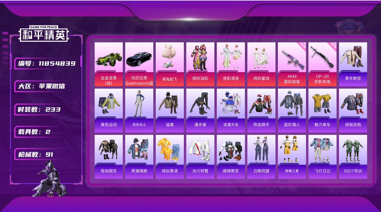 - [12171754]2粉装 4特效枪 6印记 可二次 可修改实名 优质装备:GROZA-镜光银凌,AUG-暖羊咩咩,绯穹魔姬,Kar98K-巳巳如意 热门装扮:闲梦青缨,鹰眼刺客 稀有枪皮:DP-28-豹影疾电 五级特效枪:五级GROZA-镜光银凌,五级Kar98K-巳巳如意,五级DP-28-豹影疾电,五级AUG-暖羊咩咩 紫色装扮:霓虹热舞,SS30特训套装,SS31特训套装,云朵鹅,彩虹兔,雪绒豹,SS33特训套装,青涩时光,顶瓜瓜,冷焰舞者,完美偶像,帅气教官,幻影武者,冰川特警,人气偶像,天籁歌者,竞技角斗士,黄色名流,魅力单车,鹤鸣,黄色伏地魔,黄色运动,黑色伏地魔,龟仙人,霓虹街区,酒红色名流,长空猛禽,绛羽幽主,深蓝色名流,湖蓝色名流,热血青春,海岛探路者,暗金炫舞,柠萌假日,红色运动,绮丽涂鸦,缤纷果语,蓝色运动,特殊使命,特训学院,猛禽,空岛之星,白熊同盟,白色伏地魔,破晓战魂,破蛋小黄鸡,神秘领域,萝兰蝴蝶,SS29特训,小熊娃娃,狂花道·娜可露露,星途旅人,雏菊兔兔,热情海星,SS28特训,白光莹,鱼渊荷华,玉兔迎春,燕燕于飞,巳巳如意,森林游猎者,熊抱抱,智谋强哥,小狗蛇点点,石蕴玉辉,异域银装,青团波波,糖糖葫芦,棉花软糖,竞技名士,都市丽猫,街头风暴,SS25特训,SS27特训,焰鹰斗篷,幻羽潜行,幽夜迷踪,华灯初上,SS26特训,耀粉歌者,大橘大利,星渊小夜曲,SS32特训服(SS32特训套装),蓝冰羽,紫幽梦,粉恋花,白糯汤圆,恋语绒绒,光之冒险,冰冻风暴 优质战备:墨龙九天降落伞,拳皇·狂花道降落伞,星途旅人降落伞,闲梦青缨降落伞,猪猪侠降落伞,无垠阁降落伞,荧海星豚降落伞,彩虹独角兽飞行器,月下星之子飞行器,彩虹独角兽降落伞,梦幻火箭降落伞