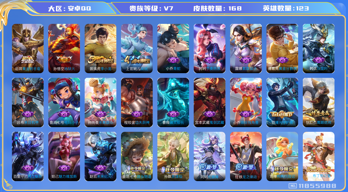 [11855988]【商品标题】:安卓Q-V7-至尊星耀III段位-123英雄-168皮肤-0典藏-0珍品无双-0无双-0珍品传说-2传说-34史诗