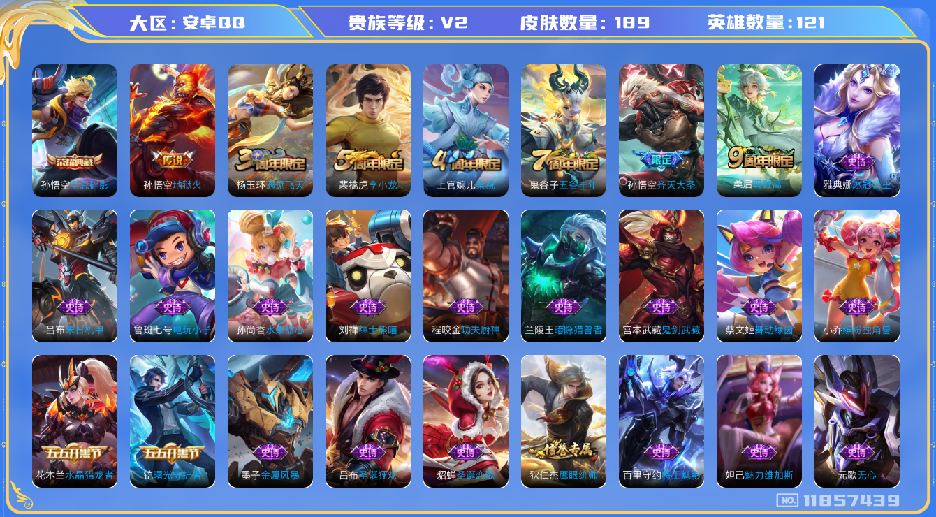[11857439]【商品标题】:安卓Q-V2-永恒钻石IV段位-121英雄-189皮肤-1典藏-0珍品无双-0无双-0珍品传说-3传说-34史诗