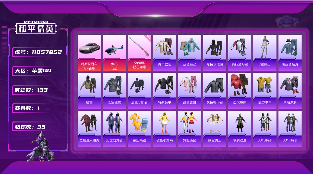[11857952]1特效枪 1载具 可二次 可修改实名 优质装备:特斯拉Roadster(沁心粉),Kar98K-巳巳如意 载具:空客H135-蔚蓝之翼 一级特效枪:一级Kar98K-巳巳如意 紫色装扮:SS22特训,SS21特训,SS31特训套装,SS20特训,SS15特训,SS16特训,骁骑迪迦,SS14特训,飞驰魅影,音速流光,SS19特训,SS17特训,SS18特训,长空猛禽,霓虹街区,青年教官,缤纷果语,蓝色守护者,蓝色运动,骑行爱好者,魅力单车,黑色伏地魔,幻世战舞者,怒火燎原,探宝勇士,湖蓝色名流,绮丽涂鸦,破蛋小黄鸡,甜蜜告白,福星高照,竞技达人朋克,灰色格斗者,猛禽,特战装甲,竞技名士,光之冒险