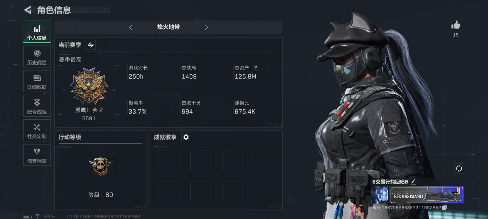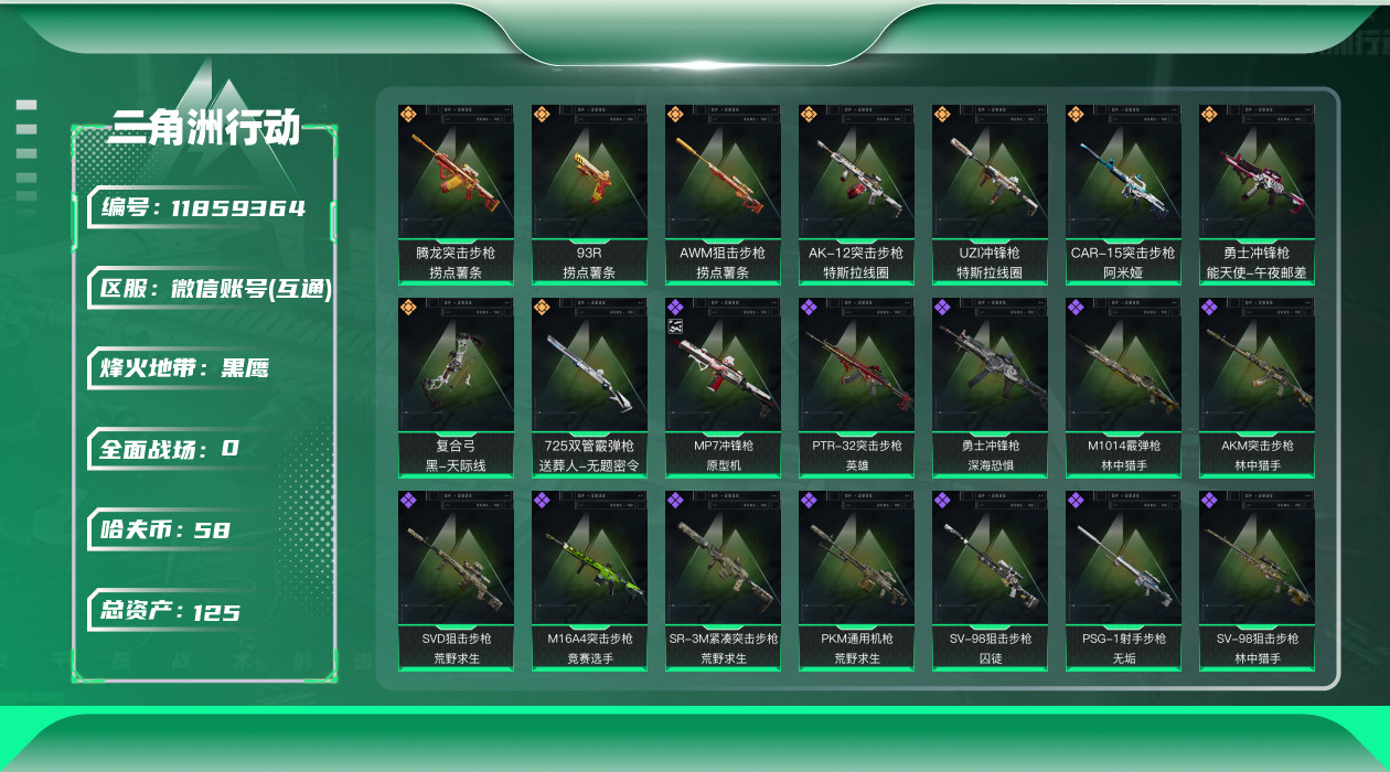 [11859364]总资产:125.8M 1干员外观 9传说枪械 哈夫币:58.912K 高级安全箱(9.15到期) 安全保护中 可二次 可修改实名 烽火地带段位:黑鹰 全面战场段位:无段位 传说武器皮肤:UZI冲锋枪-特斯拉线圈,AWM狙击步枪-捞点薯条,腾龙突击步枪-捞点薯条,93R-捞点薯条,AK-12突击步枪-特斯拉线圈,勇士冲锋枪-能天使-午夜邮差,复合弓-黑-天际线,725双管霰弹枪-送葬人-无题密令,CAR-15突击步枪-阿米娅 史诗武器皮肤:MP7冲锋枪-原型机(典藏),PKM通用机枪-蝮蛇,QJB201轻机枪-Old Habits,M1014霰弹枪-林中猎手,勇士冲锋枪-深海恐惧,SG552突击步枪-深海恐惧,AKM突击步枪-林中猎手,M16A4突击步枪-竞赛选手,M250通用机枪-囚徒,SV-98狙击步枪-林中猎手,PTR-32突击步枪-英雄,SV-98狙击步枪-囚徒,腾龙突击步枪-无垢,MP7冲锋枪-无垢,PSG-1射手步枪-无垢,SVD狙击步枪-荒野求生,SR-3M紧凑突击步枪-荒野求生,PKM通用机枪-荒野求生 干员外观:露娜-黑·天际线