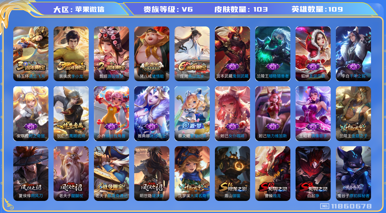 [11860678]V6 109英雄 103皮肤 典藏英雄武则天 可修改实名 限定皮:遇见飞天,高山流水,游园惊梦,李小龙,猪悟能 史诗皮:千年之狐,冰冠公主,偶像歌手,女仆咖啡,时之奇旅-安琪拉,暗隐猎兽者,鬼剑武藏,繁星吟游(呼啦呼啦),缤纷独角兽,圣诞恋歌,鹰眼统帅,魅力维加斯