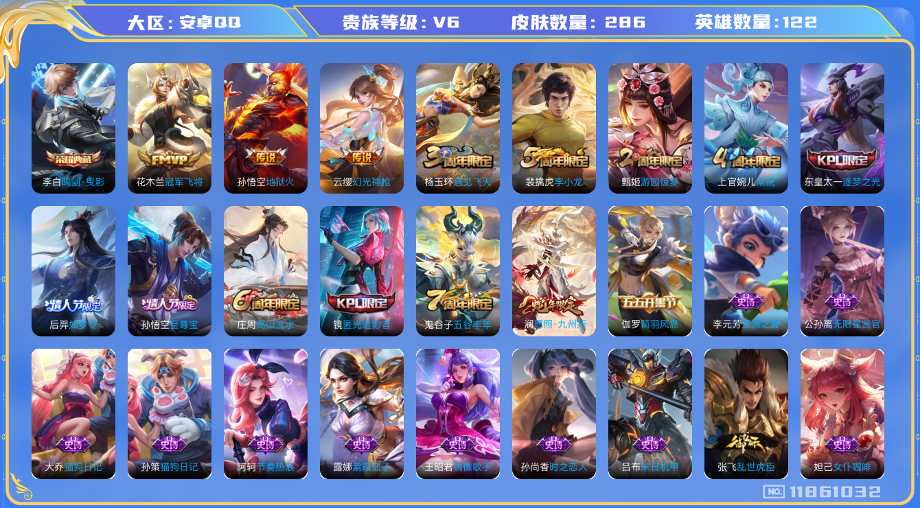 [11861032]【商品标题】:安卓Q-V5-至尊星耀IV段位-122英雄-286皮肤-1典藏-0珍品无双-0无双-0珍品传说-4传说-75史诗