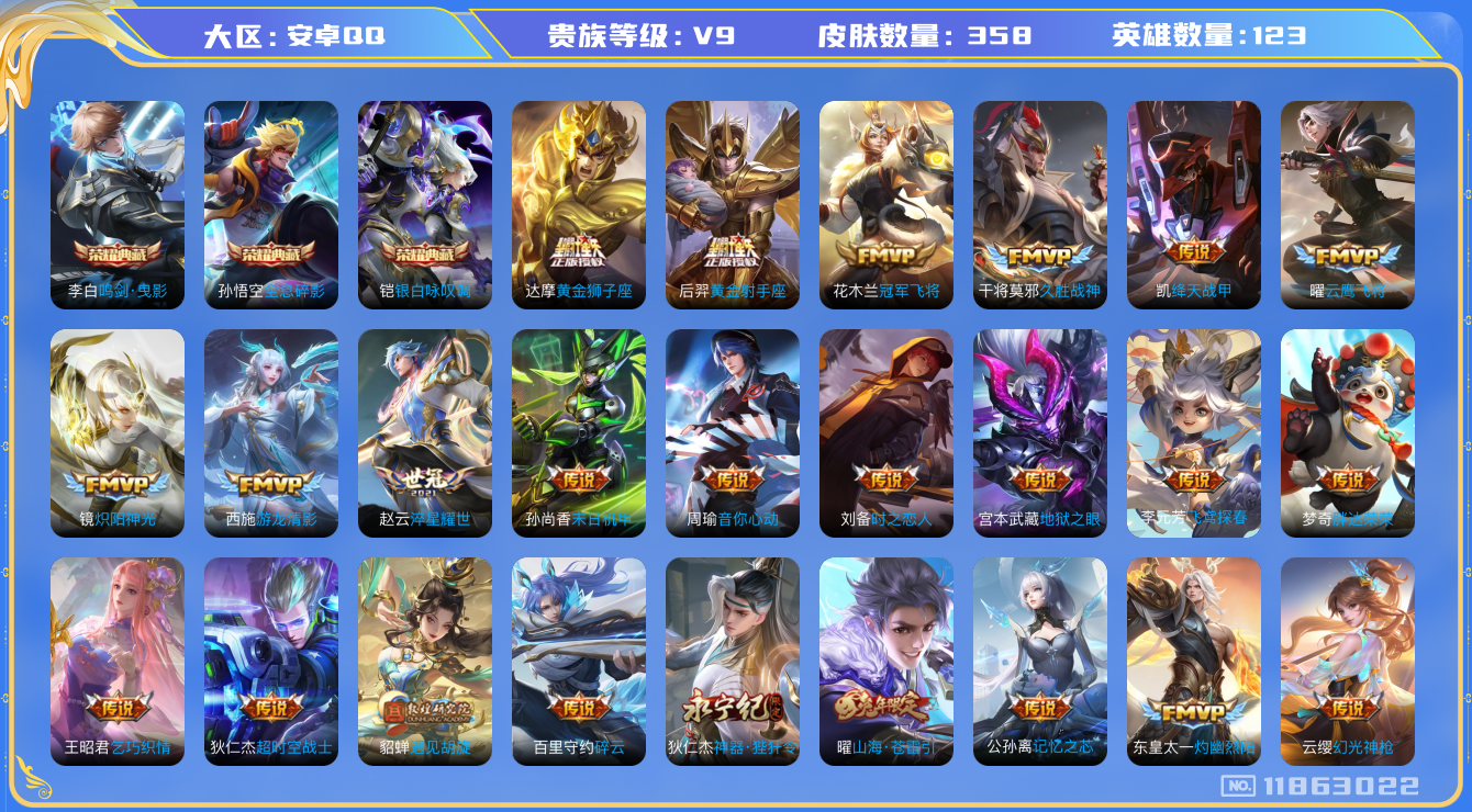 [11863022]【商品标题】:安卓Q-V9-最强王者段位-123英雄-358皮肤-3典藏-0珍品无双-0无双-0珍品传说-31传说-96史诗