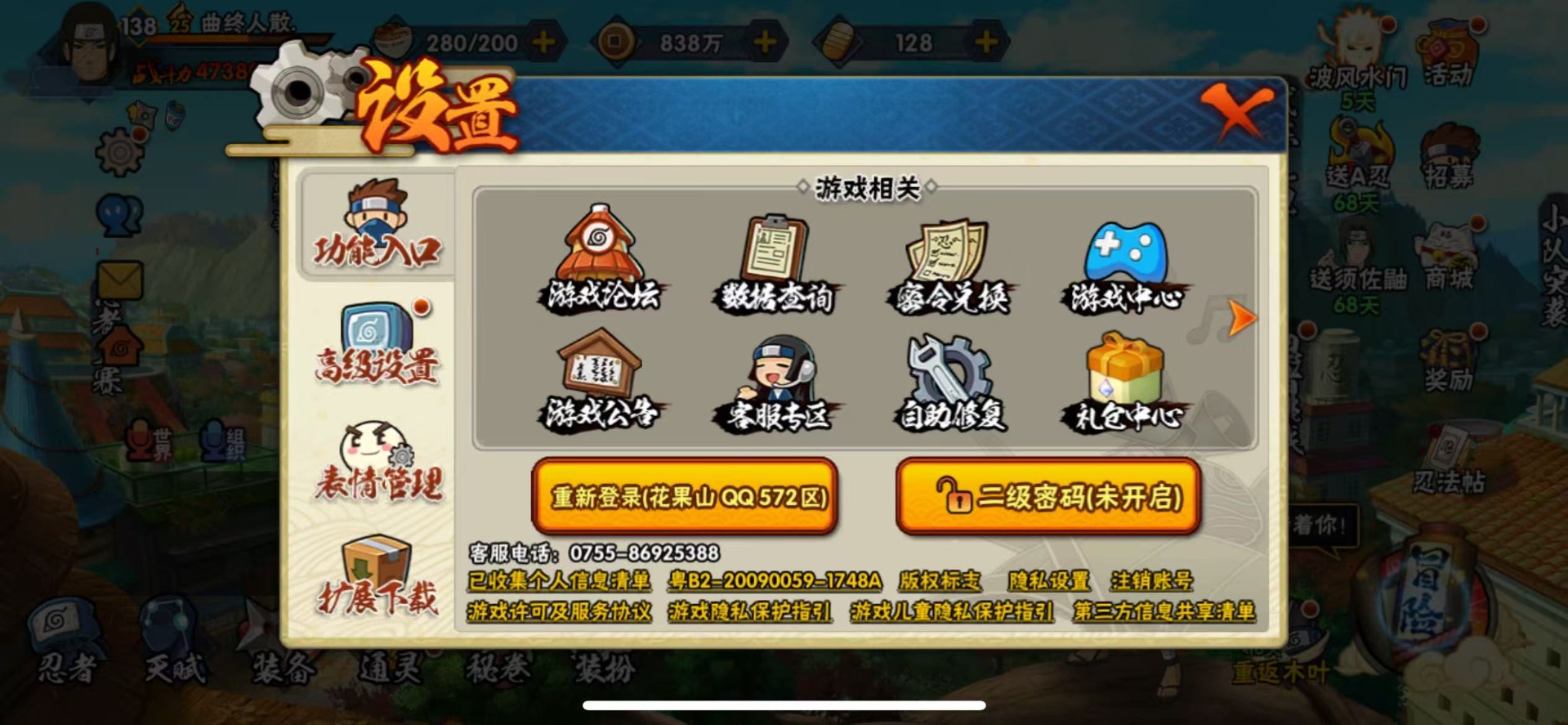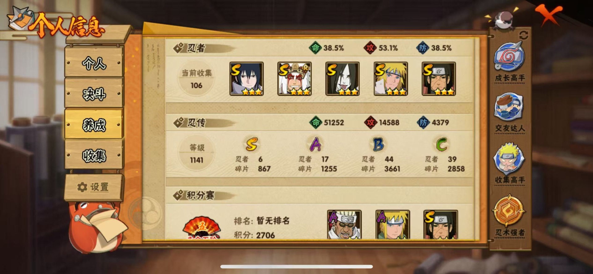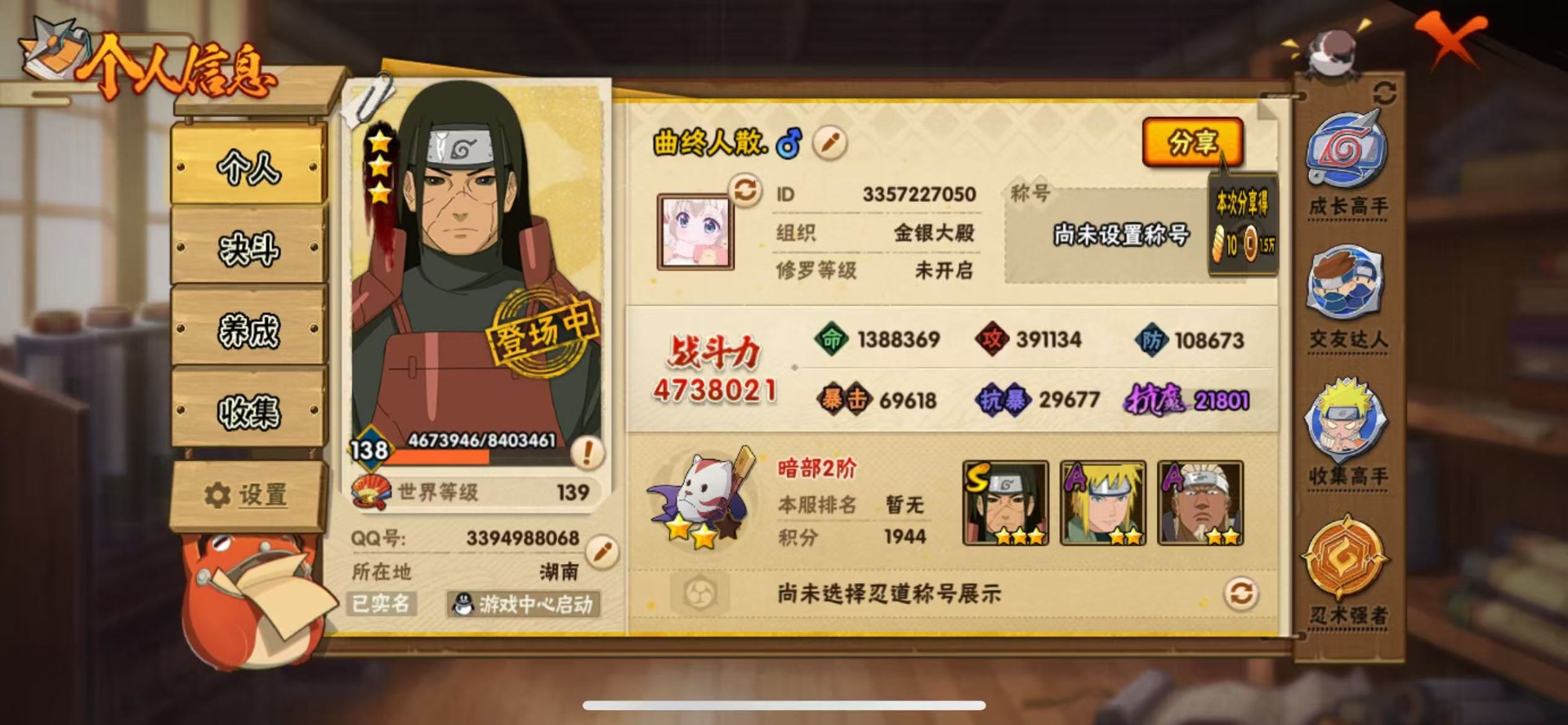 [11863906]V5 5S忍 16A忍 13通灵 423.3W战力 可二次 可修改实名 优质装备:千手柱间「秽土转生」,宇智波带土 「忍界大战」 S级忍者:自来也 「舞之豪杰」,波风水门,大蛇丸