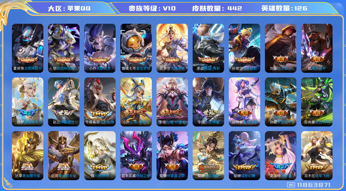 [11863871]V10 7典藏 55传说 126英雄 442皮肤 典藏英雄武则天 可修改实名 优质装备:天鹅之梦(小乔典藏),星空梦想(太空人),无限飓风号(高达),鸣剑·曳影,全息碎影(猴子典藏),九霄神辉(木兰典藏),银白咏叹调(倪克斯侍卫),黄金狮子座,黄金射手座,冠军飞将,云鹰飞将(小将军),绛天战甲(鸡嘴战神),黄金白羊座,猫影幻舞,久胜战神,炽阳神光,一念神魔,云霓雀翎,末日机甲-孙尚香(绿蚂蚱),地狱火,仲夏夜之梦(大飞蛾),地狱之眼,飞鸢探春,胖达荣荣,时之恋人-刘备(电焊工),游龙清影(小青龙),淬星耀世,超时空战士-狄仁杰,遇见胡旋,末日机甲-孙策,花朝如约(花篮子),无双飞将,音你闪耀(rap皮),碎云,神器·狴犴令,山海·炽霜斩(李信年限),山海·琳琅生(小乔年限),山海·苍雷引(电光曜子),炽翼辉光(娃娃菜牛角包),浮生妄,艾琳觅芳踪,涂山容容 珍宝阁皮:妄想食味,胡桃夹子,蔷薇恋人,女武神 限定皮:鸣野蒿,夏侯惇霜北刀,武陵仙君(小桃花),异界灵契(白毛香),傲雪梅枪,寅虎·展翼(孙膑年限),前尘镜,星穹之声,绯月行,魔法小厨娘,白晶晶,时雨天司(水龙头),神威(电光马子),飞衡(韩信年限),玄嵩(庄周年限),山海·碧波行(瑶年限),瑞麟志(木兰年限),高山流水,诗剑行,齐天大圣,匿光决锋者,怒海麟威,降魔,五谷丰年,青龙志(铠年限),幽恒(沐浴露),武圣,天狼运算者,梁祝,御风骁将(吕布年限),天狼狩猎者,龙胆,烈魂,岱宗(典韦年限),虎魄,祈雪灵祝(雪兔子),玄武志(苏烈年限),朱雀志(守约年限),永曜之星,辉光之辰,如梦令-嫦娥,如梦令-后羿,孙行者,猪悟能,青春决赛季,匿光追影者,女儿国国王,寅虎·御盾(廉颇年限),寅虎·瑞焰(虎皮蛋子),寅虎·心曲(虎婆),寅虎·赤拳(老虎年限),百木心枪,玉兔公主,启示之音,无尽星芒,深海之息(深海大菠萝),唐三藏,枫霜尽,匿光启智者,时之奇旅-妲己,神器·万象笔,梦圆繁星,山海·玄木吟(马可年限),冰霜神祇 史诗皮:灵蛊蚀心,星界战将,怒海争锋,撼地雄心,破空之剑,战舞者,蒙犽顽岩魄,蔬乡物语(鲁班七号),织梦人,遇见神鹿,紫霞仙子,苍穹之光,电玩小子(小书包),黄金分割率,特工魅影,千年之狐,永昼,江河有灵,真我赫兹(镜),魅语,百解令(蒙犽),高渐离燃音魔法,蒙恬荣光圣徽,无限星赏官,匿光破解者,冰