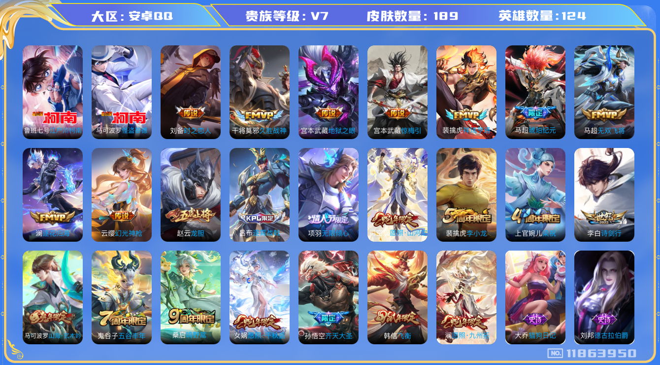 [11863950]V7 2珍品传说 16传说 124英雄 189皮肤 可修改实名 优质装备:江户川柯南,怪盗基德,久胜战神,地狱之眼,时之恋人-刘备(电焊工),无双飞将,惊梅引,澜逐花归海,琥珀纪元马超,涂山容容 传说皮:祥瑞亨通,幻光神枪 珍宝阁皮:蔷薇恋人,女武神 限定皮:愿照·九州拓(澜年限),愿照·山河定(司空震年限),愿照·千秋盛(女娲年限),逐霄战戟,鸣野蒿,飞衡(韩信年限),无限倾心-项羽,诗剑行,齐天大圣,五谷丰年,梁祝,龙胆,李小龙,山海·玄木吟(马可年限) 史诗皮:器灵·浮梦炉,化蝶舞,灵蛊蚀心,星界战将,谪仙醉月,龙之律动,百相守梦-周瑜,茶境仙,百相守梦-黄忠,特工魅影,江河有灵,蒙恬荣光圣徽,电玩·爆裂旋风,百相守梦(刘备),猫狗日记-孙策,猫狗日记-大乔,节奏热浪,摇滚巨星,水果甜心,星夜王子,德古拉伯爵,暗隐猎兽者,幽灵船长,鬼剑武藏,心灵战警,纤云弄巧,拒霜思,缤纷独角兽,水晶猎龙者,曙光守护者,金属风暴,圣诞狂欢,圣诞恋歌,鹰眼统帅,魅力维加斯,黎明之约,赏金猎手
