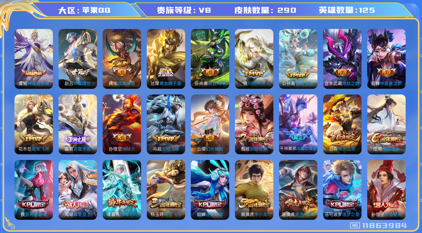 [11863984]V8 1典藏 18传说 125英雄 290皮肤 可修改实名 优质装备:神鉴启示录,黄金狮子座,冠军飞将,炽阳神光,末日机甲-孙尚香(绿蚂蚱),地狱火,仲夏夜之梦(大飞蛾),地狱之眼,淬星耀世,无双飞将,玄雷天君 传说皮:典韦战鼓燎原,云诺千山,幻光神枪 珍宝阁皮:万物之道,女武神 限定皮:愿照·九州拓(澜年限),白虎志(电光耗子),时雨天司(水龙头),神威(电光马子),遇见飞天,高山流水,冰锋战神,游园惊梦,逐梦之星,逐梦之音,李小龙,辉光之辰,霸王别姬-虞姬,真爱至上,大圣娶亲,冰霜恋舞曲,匿光追影者,寅虎·赤拳(老虎年限) 史诗皮:苍鳞隐世,糖绘人间,狼魂孤将,化蝶舞,星界战将,龙之律动,百相守梦-百里守约,百相守梦-黄忠,紫霞仙子,苍穹之光,黄金分割率,千年之狐,江河有灵,魅语,百解令(蒙犽),冰冠公主,偶像歌手,晚萤,龙骑士(小龙虾),末日机甲-吕布,猫狗日记-孙策,乱世虎臣,节奏热浪,修罗,女仆咖啡,摇滚巨星,水果甜心,天才门将,星夜王子,心灵骇客,德古拉伯爵,暗隐猎兽者,幽灵船长,鬼剑武藏,天秀·启明,舞动绿茵,地狱岩魂,纤云弄巧,繁星吟游(呼啦呼啦),拒霜思,缤纷独角兽,乘风破浪,水晶猎龙者,金属风暴,原初追逐者,圣诞狂欢,圣诞恋歌,鹰眼统帅,王者之锤,暗夜贵公子,魅力维加斯,黎明之约,未来纪元-赵云