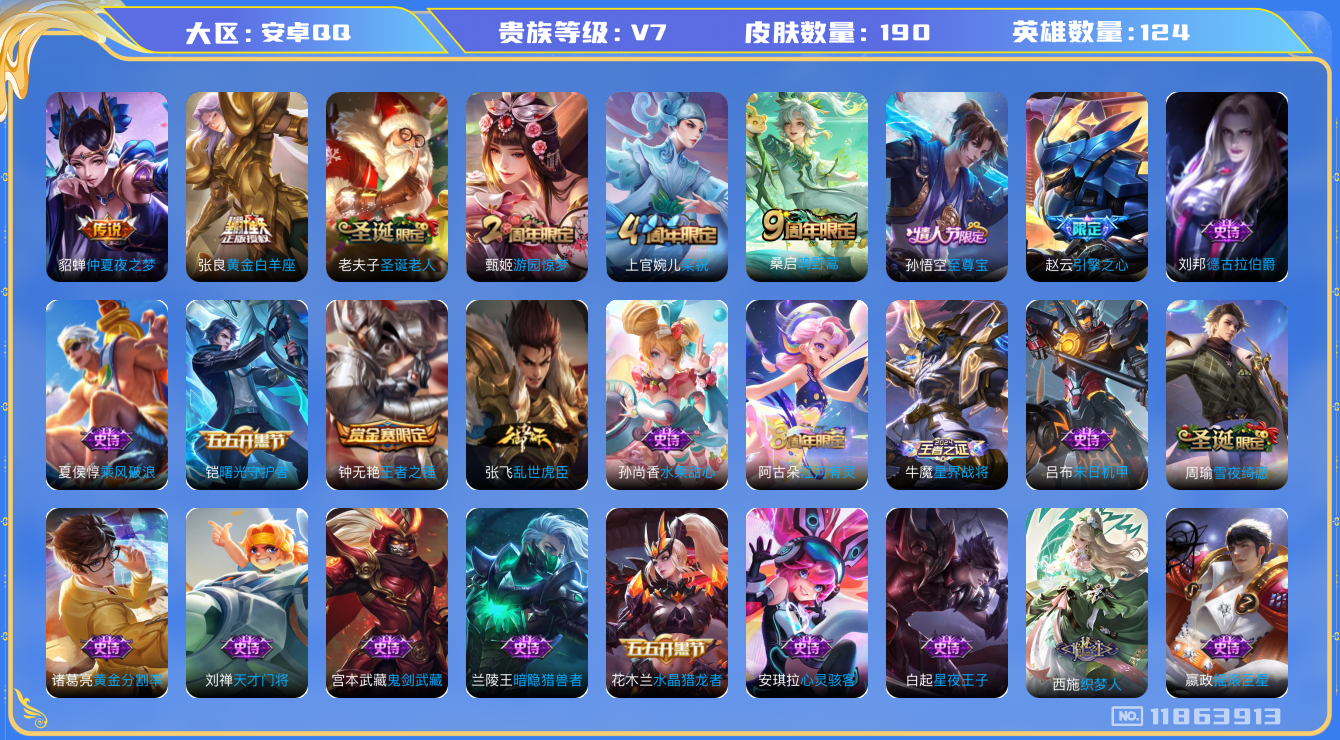 [11863913]V7 3传说 124英雄 190皮肤 可修改实名 优质装备:黄金白羊座,仲夏夜之梦(大飞蛾) 珍宝阁皮:蔷薇恋人 限定皮:鸣野蒿,至尊宝,游园惊梦,梁祝,圣诞老人,引擎之心 史诗皮:星界战将,织梦人,白龙吟,黄金分割率,特工魅影,江河有灵,雪夜绮愿(周瑜),末日机甲-吕布,乱世虎臣,摇滚巨星,水果甜心,天才门将,星夜王子,心灵骇客,德古拉伯爵,暗隐猎兽者,鬼剑武藏,舞动绿茵,乘风破浪,水晶猎龙者,曙光守护者,鹰眼统帅,王者之锤,魅力维加斯