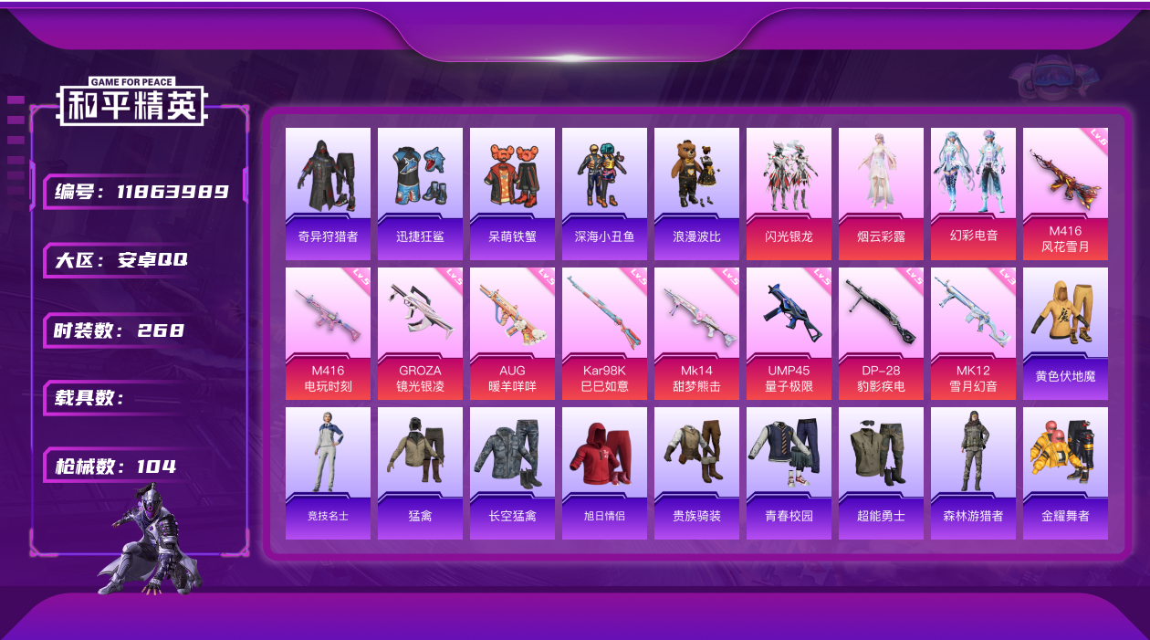 [11863989]3粉装 9特效枪 6印记 可二次 可修改实名 优质装备:奇异狩猎者,M416风花雪月,M416电玩时刻,UMP45量子极限,GROZA-镜光银凌,AUG-暖羊咩咩,MK12-雪月幻音,MK14-甜梦熊击,幻彩电音,Kar98K-巳巳如意 热门装扮:闪光银龙,烟云彩露,迅捷狂鲨,呆萌铁蟹,深海小丑鱼,浪漫波比 稀有枪皮:DP-28-豹影疾电 六级特效枪:六级M416-风花雪月 五级特效枪:五级UMP45-量子极限,五级GROZA-镜光银凌,五级Kar98K-巳巳如意,五级DP-28-豹影疾电,五级MK14-甜梦熊击,五级AUG-暖羊咩咩,五级M416-电玩时刻 三级特效枪:三级MK12-雪月幻音 紫色装扮:SS31特训套装,旭日情侣,SS30特训套装,云朵鹅,彩虹兔,雪绒豹,SS33特训套装,顶瓜瓜,长空猛禽,青春校园,缤纷果语,超能勇士,无面战甲,绛羽幽主,蜜露汐语,黄色伏地魔,冰河战士,蝶变,白熊同盟,破蛋小黄鸡,王牌教练,猛禽,SS29特训,纯真浪花,热情海星,曼妙人鱼,SS28特训,迎夏光舞,冰公主,光矢逐梦,异域银装,鱼渊荷华,燕燕于飞,巳巳如意,森林游猎者,俏兔智灵,竞技名士,净心行者,焰鹰斗篷,幻羽潜行,SS27特训,小丑鱼,智谋强哥,大橘大利,星渊小夜曲,耀粉歌者,粉恋花,蓝冰羽,紫幽梦,SS32特训服(SS32特训套装),金耀舞者,贵族骑装,弄潮海豚 优质战备:墨龙九天降落伞,闲梦青缨降落伞,绯穹魔姬降落伞,祥瑞起舞飞行器,临安公主降落伞,圣域龙灵降落伞,春暖花开降落伞