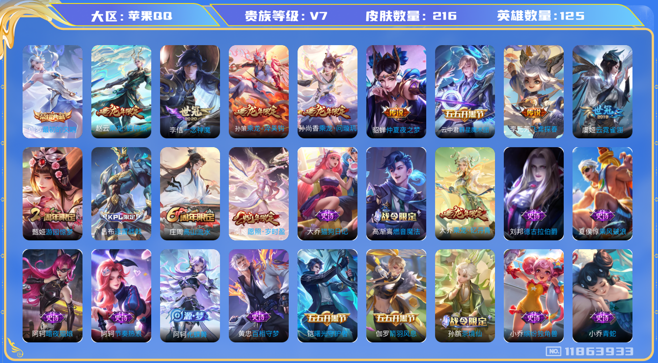[11863933]V7 1典藏 9传说 125英雄 216皮肤 可修改实名 优质装备:最初的交响(伽罗典藏),一念神魔,云霓雀翎,仲夏夜之梦(大飞蛾),飞鸢探春,云中君群星魔术团,涂山容容 传说皮:乘龙·问璇玑(孙尚香年限),乘龙·铭钟鼎(赵云年限),乘龙·淬吴钩(孙策年限) 珍宝阁皮:蔷薇恋人 限定皮:愿照·岁时盈(虞姬年限),逐霄战戟,高山流水,游园惊梦 史诗皮:赞萌露比,鸭鸭历险记-刘禅,器灵·浮梦炉,化蝶舞,星界战将,龙之律动,雪豹·霜爪,石田雨龙,百相守梦-周瑜,茶境仙,上官婉儿群星魔术团,乘龙·聚宝船(安琪拉年限),乘龙·忆丹青(大乔年限),百相守梦-百里守约,百相守梦-黄忠,织梦人,紫霞仙子,电玩小子(小书包),黄金分割率,特工魅影,江河有灵,匿光侦查者,真我赫兹(百里守约),完美假期,魅语,百解令(蒙犽),高渐离燃音魔法,青蛇,偶像歌手,晚萤,暗夜猫娘,末日机甲-吕布,猫狗日记-孙策,猫狗日记-大乔,时之恋人-孙尚香,节奏热浪,修罗,女仆咖啡,摇滚巨星,水果甜心,天才门将,星夜王子,功夫厨神,德古拉伯爵,暗隐猎兽者,鬼剑武藏,心灵战警,乐园奇幻夜,天秀·启明,纤云弄巧,拒霜思,缤纷独角兽,乘风破浪,逐浪之夏,曙光守护者,箭羽风息,圣诞狂欢,圣诞恋歌,鹰眼统帅,魅力维加斯,黎明之约