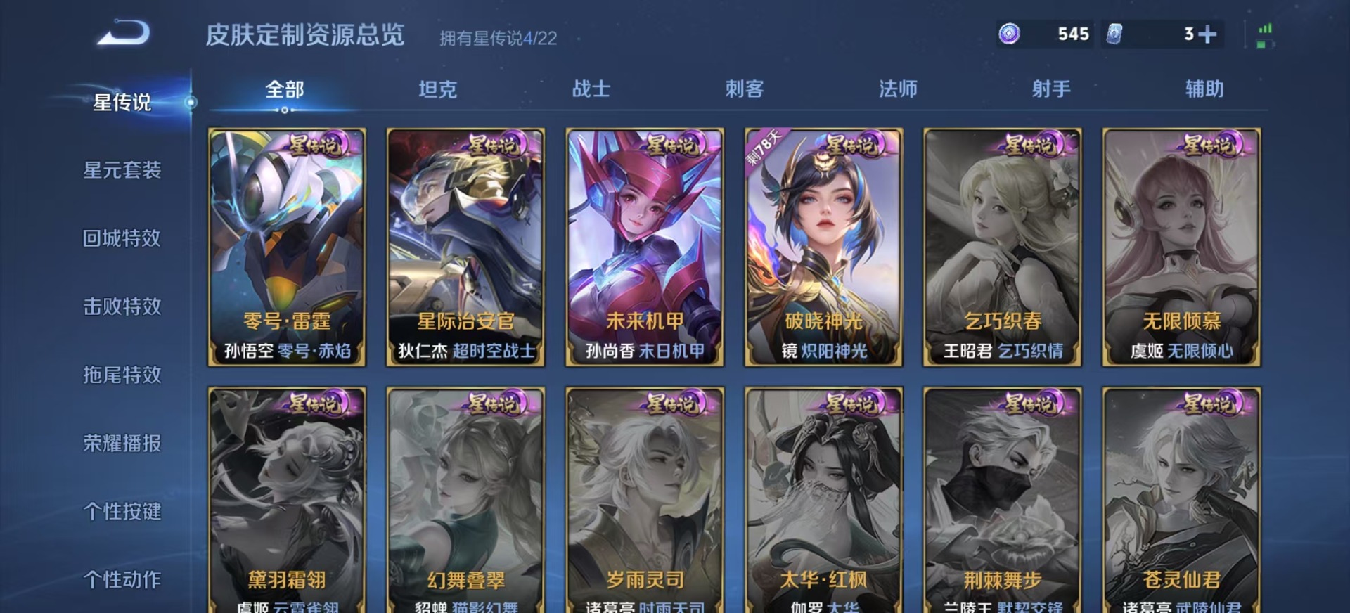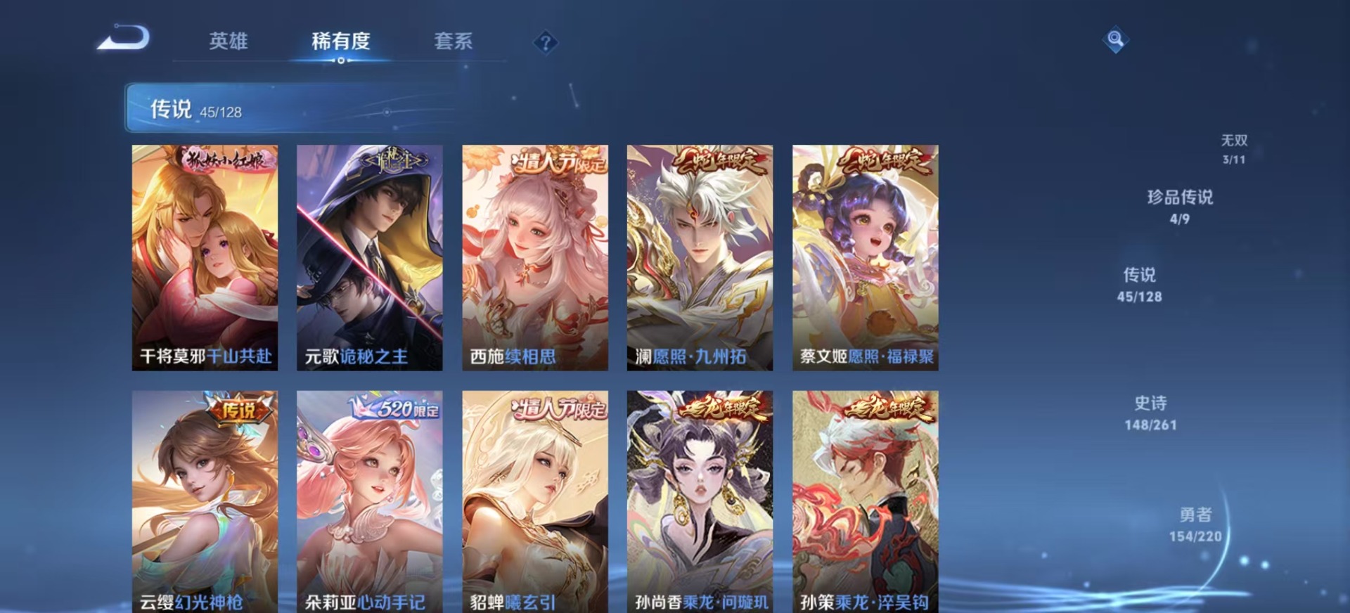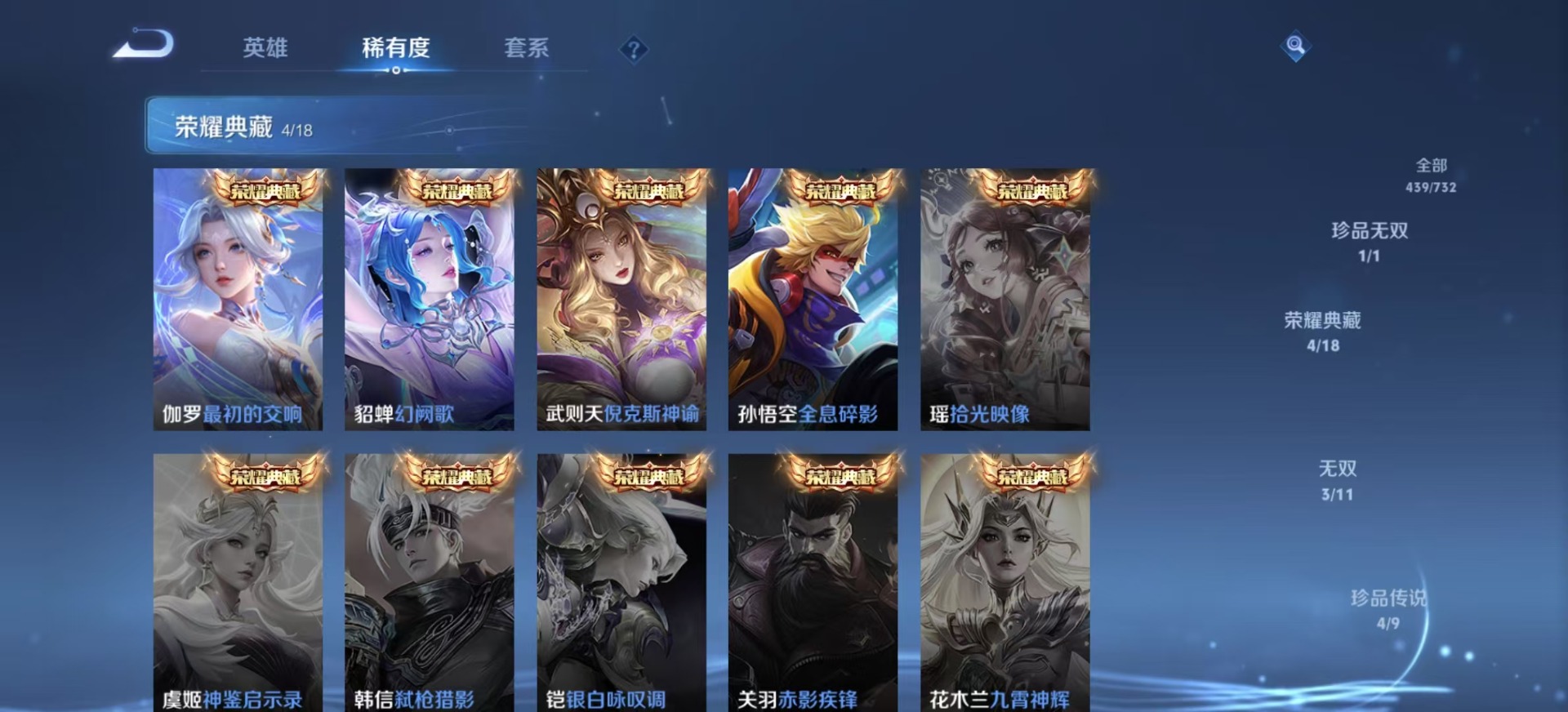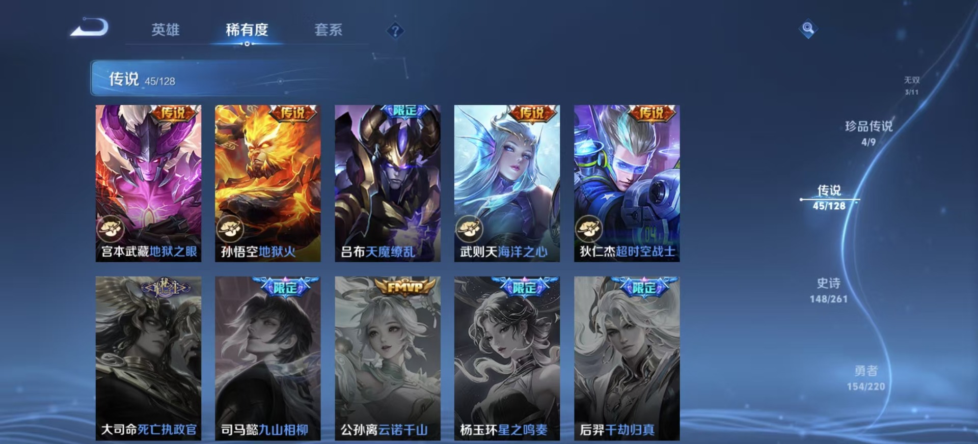 大乔白鹤梁神女,黄忠烈魂,哪吒逐梦之翼,甄姬幽恒,铠青龙志,伽罗太华,张飞虎魄,赵云龙胆,孙膑天狼运算者,干将莫邪冰霜恋舞曲,典韦岱宗,牛魔奔雷神使,鲁班七号乒乒小将,项羽霸王别姬,吕布御风骁将,后羿辉光之辰,露娜一生所爱,庄周玄嵩,诸葛亮时雨天司,兰陵王默契交锋,公孙离祈雪灵祝,公孙离蜜橘之夏,裴擒虎梅西,裴擒虎李小龙,上官婉儿梁祝,上官婉儿天狼绘梦者,李白诗剑行,花木兰默契交锋,花木兰青春决赛季,马可波罗逐梦之星,马可波罗山海·玄木吟,孙悟空孙行者,孙悟空大圣娶亲,芈月白晶晶,孙悟空至尊宝,百里玄策白虎志,马超神威,雅典娜神奇女侠,妲己时之彼端,韩信飞衡,蔡文姬奇迹圣诞,蔡文姬愿照·福禄聚,瑶时之祈愿,瑶山海·碧波行,澜愿照·九州拓,虞姬霸王别姬,嫦娥如梦令,王昭君凤凰于飞,关羽武圣