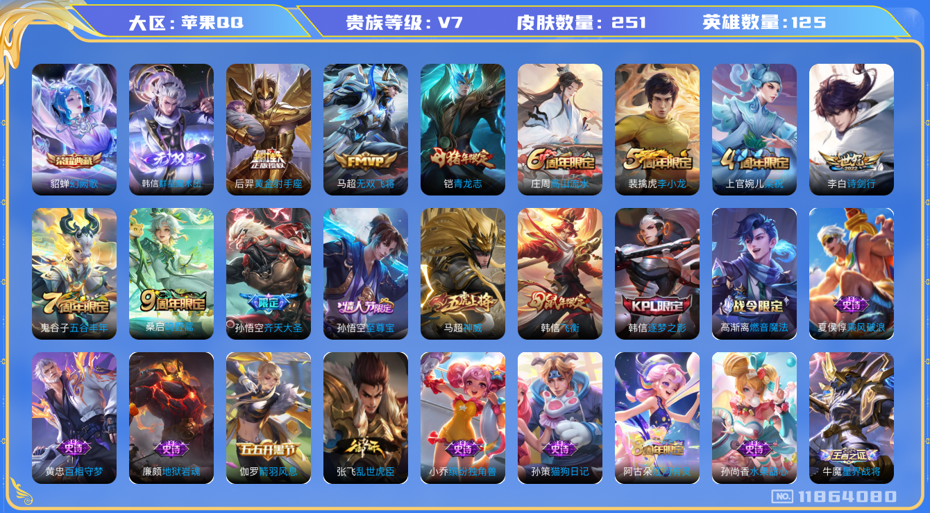 [11864080]V7 1典藏 1无双 5传说 125英雄 251皮肤 可修改实名 优质装备:幻阙歌(貂蝉典藏),韩信群星魔术团(韩信无双),黄金射手座,无双飞将 珍宝阁皮:妄想食味,优雅恋人,蔷薇恋人 限定皮:鸣野蒿,至尊宝,神威(电光马子),飞衡(韩信年限),高山流水,诗剑行,齐天大圣,五谷丰年,青龙志(铠年限),梁祝,李小龙,逐梦之影 史诗皮:灵蛊蚀心,星界战将,埋骨钱,百相守梦-百里守约,百相守梦-黄忠,电玩小子(小书包),白龙吟,特工魅影,江河有灵,百解令(蒙犽),高渐离燃音魔法,蒙恬荣光圣徽,电玩·爆裂旋风,猫狗日记-孙策,乱世虎臣,摇滚巨星,水果甜心,绅士熊喵,天才门将,暗隐猎兽者,鬼剑武藏,舞动绿茵,地狱岩魂,繁星吟游(呼啦呼啦),拒霜思,缤纷独角兽,乘风破浪,逐浪之夏,箭羽风息,金属风暴,圣诞狂欢,圣诞恋歌,鹰眼统帅,魅力维加斯,黎明之约,无心,未来纪元-赵云
