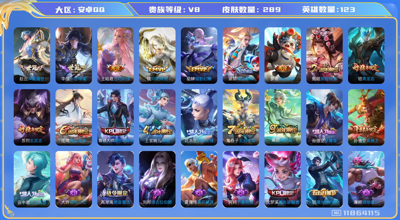 [11864115]V8 9传说 123英雄 289皮肤 可修改实名 优质装备:猫影幻舞,炽阳神光,一念神魔,胖达荣荣,乞巧织情,淬星耀世,追逃游戏(亚瑟),涂山容容 珍宝阁皮:玩趣恶龙 限定皮:鸣野蒿,至尊宝,高山流水,五谷丰年,青龙志(铠年限),游园惊梦,梁祝,玄武志(苏烈年限),默契交锋-花木兰,美猴王,时之祈愿-云中君,匿光启智者 史诗皮:谪仙醉月,石田雨龙,撼地雄心,破空之剑,琥珀纪元伽罗,蔬乡物语(鲁班七号),紫霞仙子,黄金分割率,特工魅影,江河有灵,百解令(蒙犽),高渐离燃音魔法,匿光破解者,冰冠公主,晚萤,电玩·爆裂旋风,末日机甲-吕布,猫狗日记-孙策,猫狗日记-大乔,节奏热浪,修罗,女仆咖啡,摇滚巨星,水果甜心,天才门将,星夜王子,心灵骇客,功夫厨神,德古拉伯爵,暗隐猎兽者,鬼剑武藏,心灵战警,舞动绿茵,地狱岩魂,诗语江南,纤云弄巧,拒霜思,缤纷独角兽,乘风破浪,逐浪之夏,水晶猎龙者,曙光守护者,箭羽风息,金属风暴,圣诞狂欢,圣诞恋歌,暗夜贵公子,魅力维加斯,未来纪元-赵云
