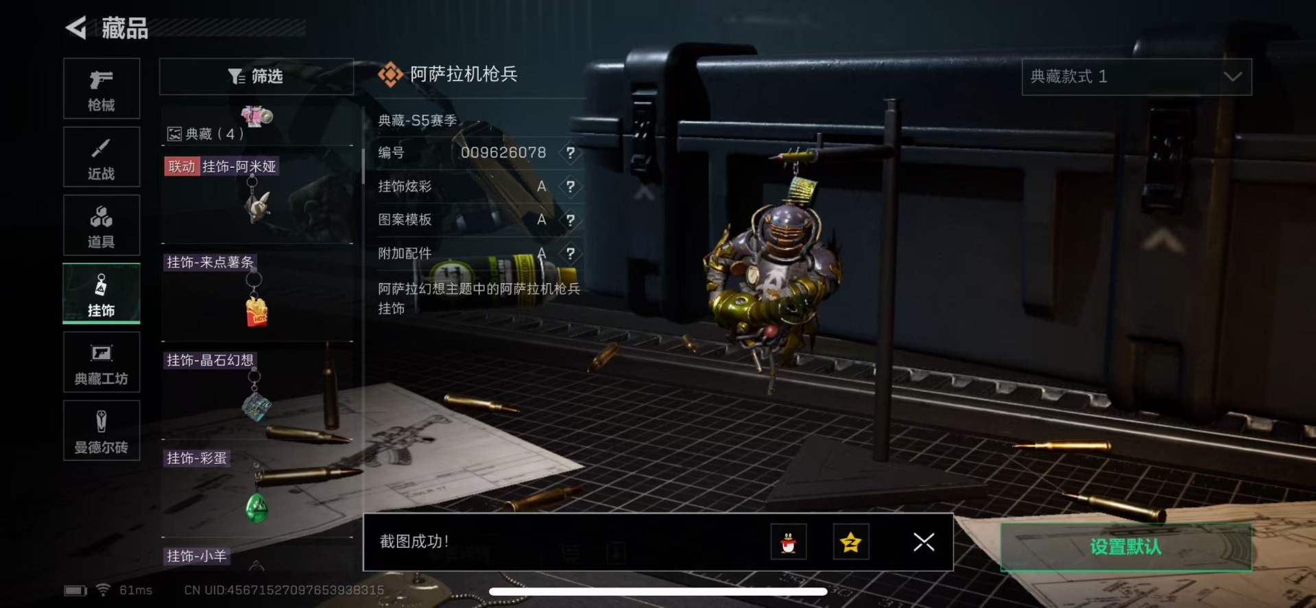 - [12040312]地铁满天赋【商品标题】:安卓 手Q-6粉装-12特效枪-2载具-8.6w热力值-14印记-197套装-275枪皮【热门品类】:套装-深海小丑鱼,套装-动感兔斯基人偶服【稀有载具】:玛莎拉蒂Ghibli(粉),幻影随行【特效枪等级】:AKM-绿萝繁花(五级),SCAR-L-锦绣绵绵(五级),M416-风花雪月(七级),GROZA-镜光银凌(五级),AUG-许七安(六级),AUG-暖羊咩咩(五级),M762-青锋波束(五级),UMP45-量子极限(五级),Kar98K-巳巳如意(五级),Mk14-甜梦熊击(五级),DP-28-豹影疾电(四级),破片手榴弹-瓶中星球(七级)【优质套装】:粉装-俏皮狐尾,角色-洛天依,粉装-银红美神,粉装-飒粉甜心,角色-阿尔茜,角色-千金淑猫