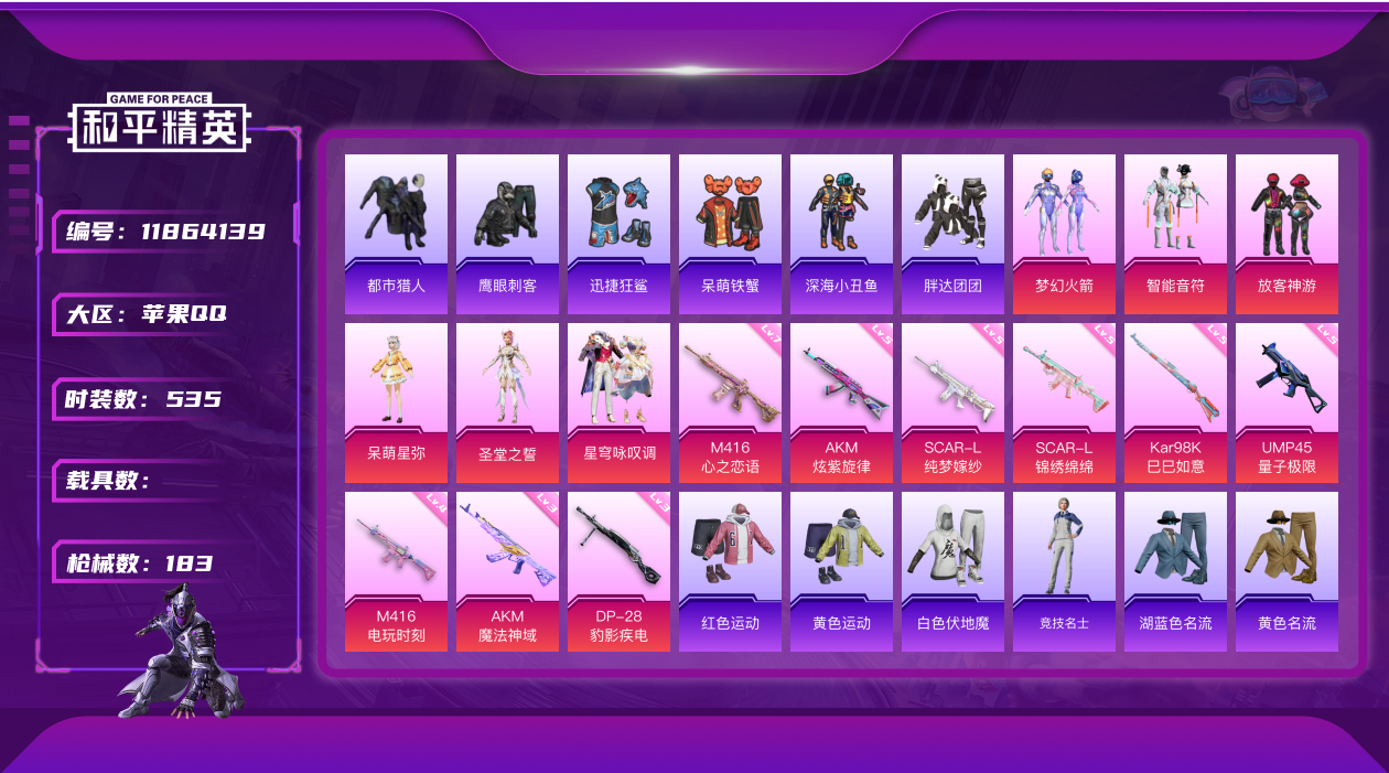 [11864139]6粉装 9特效枪 13印记 可二次 可修改实名 战神框 身法装备:都市猎人,Mark.06(新蓝螳螂) 优质装备:都市猎人,AKM炫紫旋律,M416心之恋语,梦幻火箭(新101)(新火箭少女101粉色套装),放客神游,智能音符,SCAR-L纯梦嫁纱,SCAR-L-锦绣绵绵,七级M416-心之恋语,M416电玩时刻,UMP45量子极限,AKM魔法神域,星穹咏叹调,Kar98K-巳巳如意 热门装扮:呆萌星弥,圣堂之誓,胖达团团,迅捷狂鲨,鹰眼刺客,呆萌铁蟹,深海小丑鱼,都市猎人 稀有枪皮:DP-28-豹影疾电 五级特效枪:五级UMP45-量子极限,五级Kar98K-伏魔团,五级Kar98K-巳巳如意,五级SCAR-L-纯梦嫁纱,五级SCAR-L-锦绣绵绵 四级特效枪:四级M416-电玩时刻 三级特效枪:三级AKM-魔法神域,三级DP-28-豹影疾电 紫色装扮:SS22特训,SS23特训,幻彩翩翩,妙红点点,娇憨猪猪,萌趣咩咩,SS21特训,SS31特训套装,冰川特警,冷焰舞者,旭日情侣,SS30特训套装,SS33特训套装,青涩时光,SS20特训,萌趣颜团子,特种颜团子,猎梦纪元,飞驰魅影,音速流光,极速竞梦,SS19特训,粉团憨憨,甜心亚梦,虚音幻奏,瑞龙福将,团圆交子,SS17特训,极乐追光,异彩先驱,SS18特训,都市漫游者,野性战心,长空猛禽,雪鹰学院,霓虹极客,霓虹街区,缤纷果语,耀眼新星,荣耀,荧惑魅影,蓝彩潮人,虎虎生威吉莉,街头潮人,魅力单车,鹤鸣,麻辣教官,黄色名流,黄色运动,龙的传人,龟仙人,冰河战士,龙魂突击队,蝶变,极地朋克,极速红龙,格斗先锋,沙漠兵团,海岛探路者,涂山之恋,滨海假日,幻影武者,坚韧舞者,夏日音浪,幻世战舞者,怒火燎原,探宝勇士,湖蓝色名流,滨海厨神,绮丽涂鸦,白色伏地魔,破晓战魂,破蛋小黄鸡,福星高照,空岛之星,空投萌叽,红色运动,甜蜜熊情侣,炫蓝之夏,牛气满满,猛禽,狂沙舞者,雏菊兔兔,萝兰蝴蝶,SS29特训,拉斐尔,尼罗河传说,纯真浪花,热情海星,曼妙人鱼,SS28特训,粉雾星云,Mark.06(新蓝螳螂),火种守护者(套装-火种守卫者),冰公主,鱼渊荷华,玉兔迎春,燕燕于飞,巳巳如意,竞技名士,街头风暴,情公主,惊鸿侠骨,甜梦熊熊,神气柴柴,懵萌河马,SS24特训(SS24特训套装),萤火魅影(套装-荧惑魅影),S