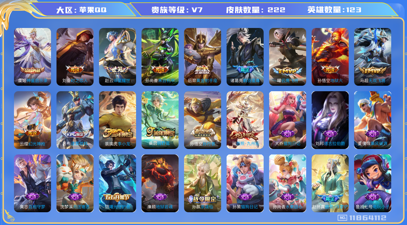 [11864112]V7 1典藏 11传说 123英雄 222皮肤 可修改实名 优质装备:神鉴启示录,黄金射手座,云鹰飞将(小将军),末日机甲-孙尚香(绿蚂蚱),地狱火,时之恋人-刘备(电焊工),淬星耀世,无双飞将,鹤羽星尊,涂山容容 传说皮:幻光神枪 珍宝阁皮:玩趣恶龙 限定皮:愿照·九州拓(澜年限),逐霄战戟,鸣野蒿,李小龙,孙行者 史诗皮:器灵·浮梦炉,茶境仙,破空之剑,百相守梦-百里守约,百相守梦-黄忠,电玩小子(小书包),黄金分割率,特工魅影,千年之狐,冰冠公主,偶像歌手,电玩·爆裂旋风,猫狗日记-孙策,猫狗日记-大乔,修罗,女仆咖啡,水果甜心,星夜王子,心灵骇客,功夫厨神,德古拉伯爵,暗隐猎兽者,鬼剑武藏,心灵战警,天秀·启明,舞动绿茵,地狱岩魂,纤云弄巧,繁星吟游(呼啦呼啦),乘风破浪,月团寄思,水晶猎龙者,曙光守护者,金属风暴,圣诞狂欢,圣诞恋歌,鹰眼统帅,暗夜贵公子,魅力维加斯,未来纪元-赵云