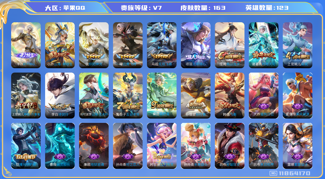 [11864170]V7 1无双 8传说 123英雄 163皮肤 可修改实名 优质装备:碎月剑心(李白无双),云鹰飞将(小将军),炽阳神光,无双飞将,山海·琳琅生(小乔年限) 珍宝阁皮:蔷薇恋人 限定皮:鸣野蒿,时雨天司(水龙头),飞衡(韩信年限),无限倾心-项羽,高山流水,诗剑行,五谷丰年,梁祝,孙行者,神器·万象笔,山海·玄木吟(马可年限) 史诗皮:龙之律动,紫霞仙子,黄金分割率,特工魅影,千年之狐,江河有灵,无限星赏官,偶像歌手,末日机甲-吕布,猫狗日记-大乔,时之恋人-孙尚香,修罗,女仆咖啡,水果甜心,暗隐猎兽者,幽灵船长,鬼剑武藏,暗渊魔法,心灵战警,地狱岩魂,纤云弄巧,乘风破浪,逐浪之夏,水晶猎龙者,曙光守护者,热力回旋,金属风暴,圣诞狂欢,圣诞恋歌,鹰眼统帅,魅力维加斯,无心