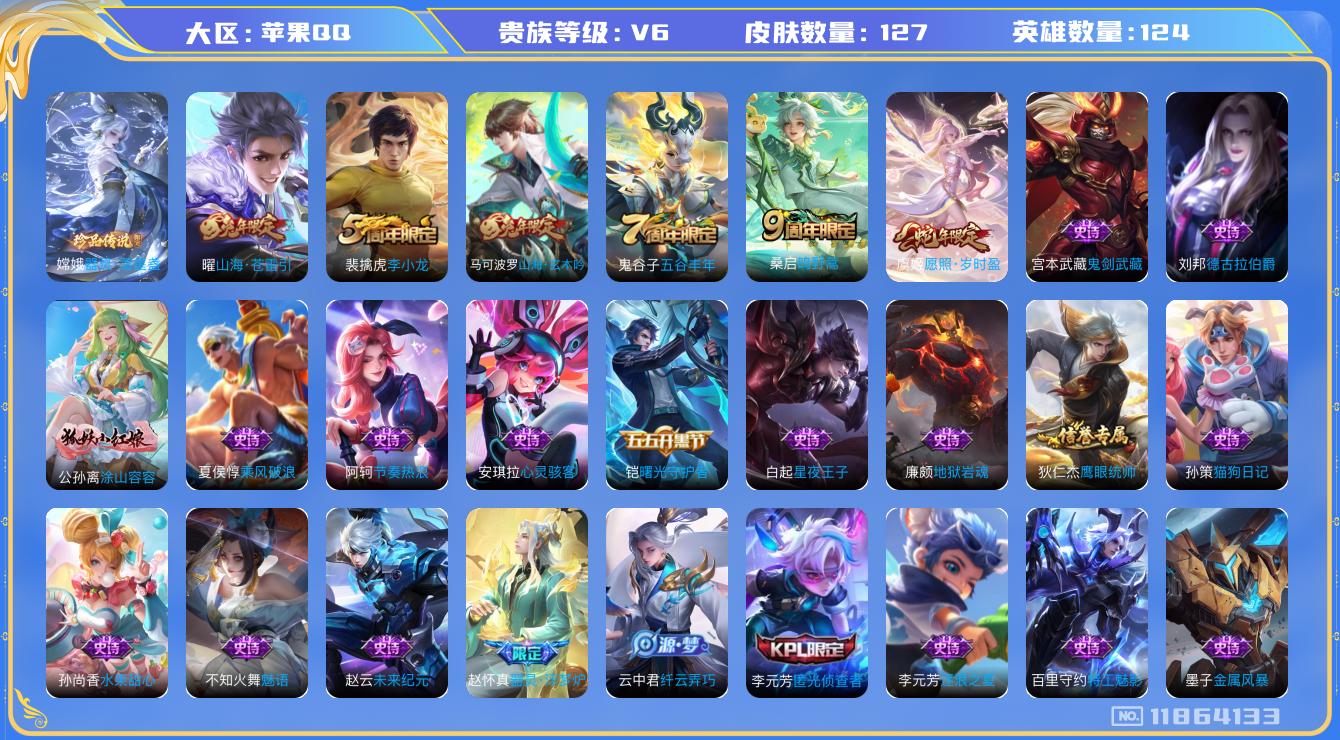 - PX_2097317-苹果Q 【可二次】 英雄数量:123 皮肤数量:202 贵族等级:贵族V8 无双限定1 荣耀典藏2 传说品质17 史诗品质56碎月剑心 幻阙歌 弑枪猎影 仲夏夜之梦 游龙清影 曦玄引女 云鹰飞将 无双飞将 久胜战神 末日机甲女 冠军飞将 怒海麟威 启明星使 地狱火 地狱之眼 黄金狮子座 逐花归海 落雪白狼 琥珀纪元男 琥珀纪元马超 至尊宝 神威 冰锋战神 心灵战警 功夫厨神