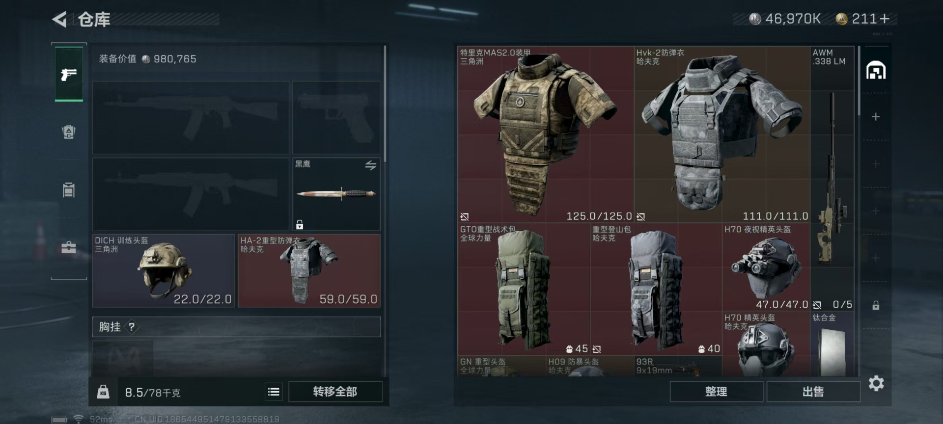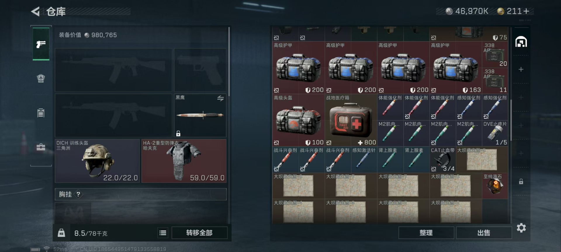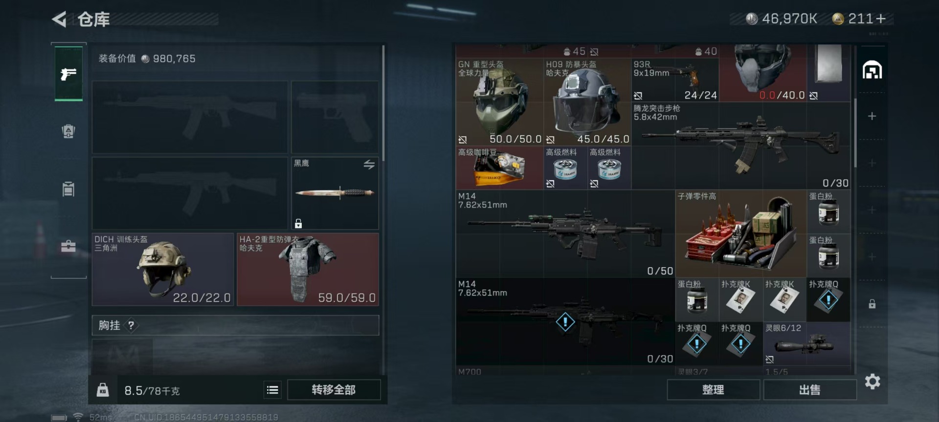 - [11546609]总资产:112.6M 7传说枪械 哈夫币:95.431K 进阶安全箱(2×2)9.15号到期 可二次 可修改实名 烽火地带段位:黑鹰 全面战场段位:无段位 传说武器皮肤:M4A1突击步枪-阿米娅,CAR-15突击步枪-阿米娅,复合弓-黑-天际线,AWM狙击步枪-捞点薯条,腾龙突击步枪-捞点薯条,93R-捞点薯条,勇士冲锋枪-能天使-午夜邮差 史诗武器皮肤:PKM通用机枪-蝮蛇,AKM突击步枪-林中猎手,M16A4突击步枪-竞赛选手,M1014霰弹枪-林中猎手,SV-98狙击步枪-囚徒,SCAR-H战斗步枪-囚徒,QBZ95-1突击步枪-曙光