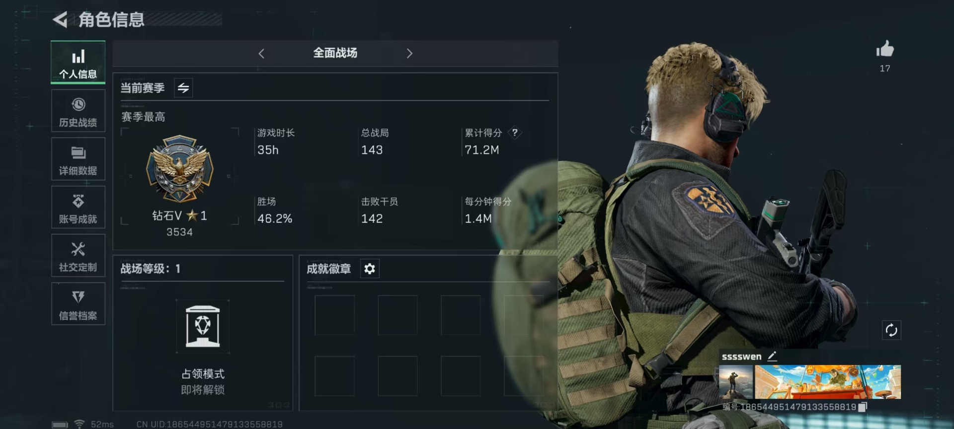 [11845895]总资产:71.2M 1传说枪械 哈夫币:46.970K 可二次 可修改实名 烽火地带段位:钻石 全面战场段位:无段位 传说武器皮肤:复合弓-黑-天际线