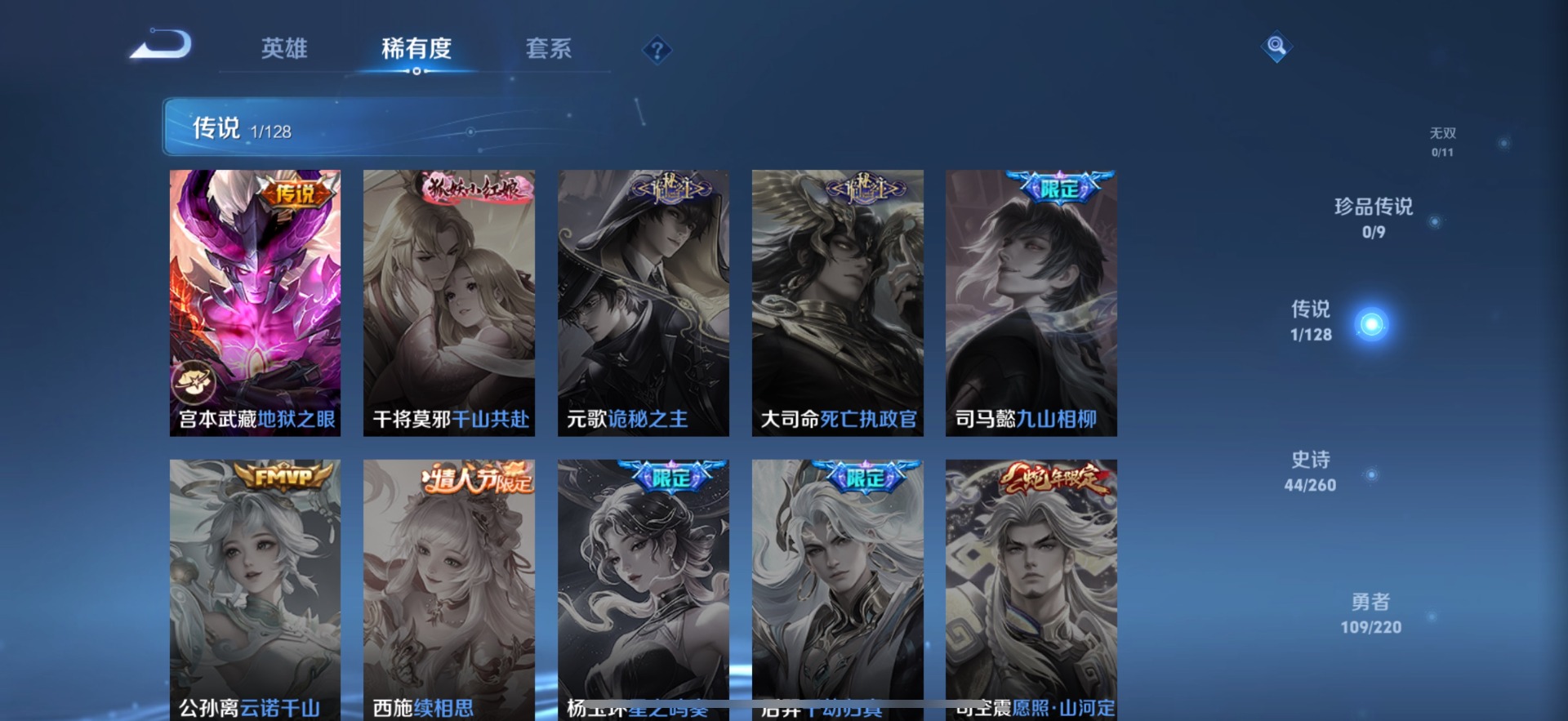 - PX_2071293-贵族等级: V8 英雄数: 123 皮肤数: 245 荣耀水晶: 鸣剑·曳影 星传说: 未来机甲 传说皮: 云鹰飞将,久胜战神,炽阳神光,一念神魔,末日机甲-孙尚香,时之恋人-刘备,淬星耀世,末日机甲-孙策,挚爱之约,无双飞将,山海·炽霜斩,浮生妄,记忆之芯,鹤羽星尊,妄想奇谈,惊梅引,霜月吟,乘龙·淬吴钩,幻光神枪 限定皮: 李小龙,御风骁将,武圣,岱宗,天狼狩猎者,美猴王